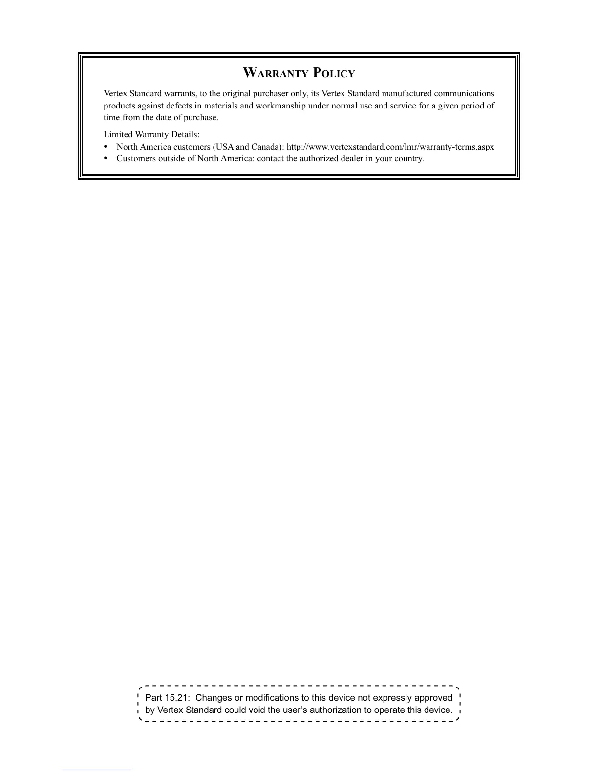 North America customers (USA and Canada): http://www.vertexstandard.com/lmr/warranty-terms.aspx