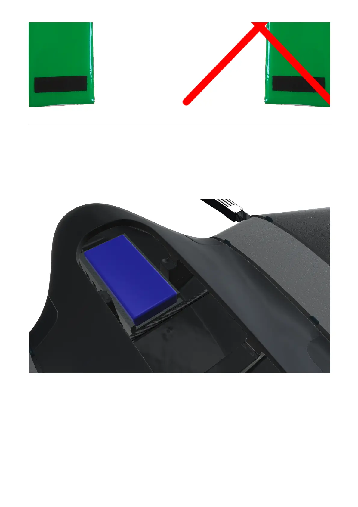 Place the LiPo inside the fuselage with the Velcro strips pointing down. Make sure to position the LiPo as far