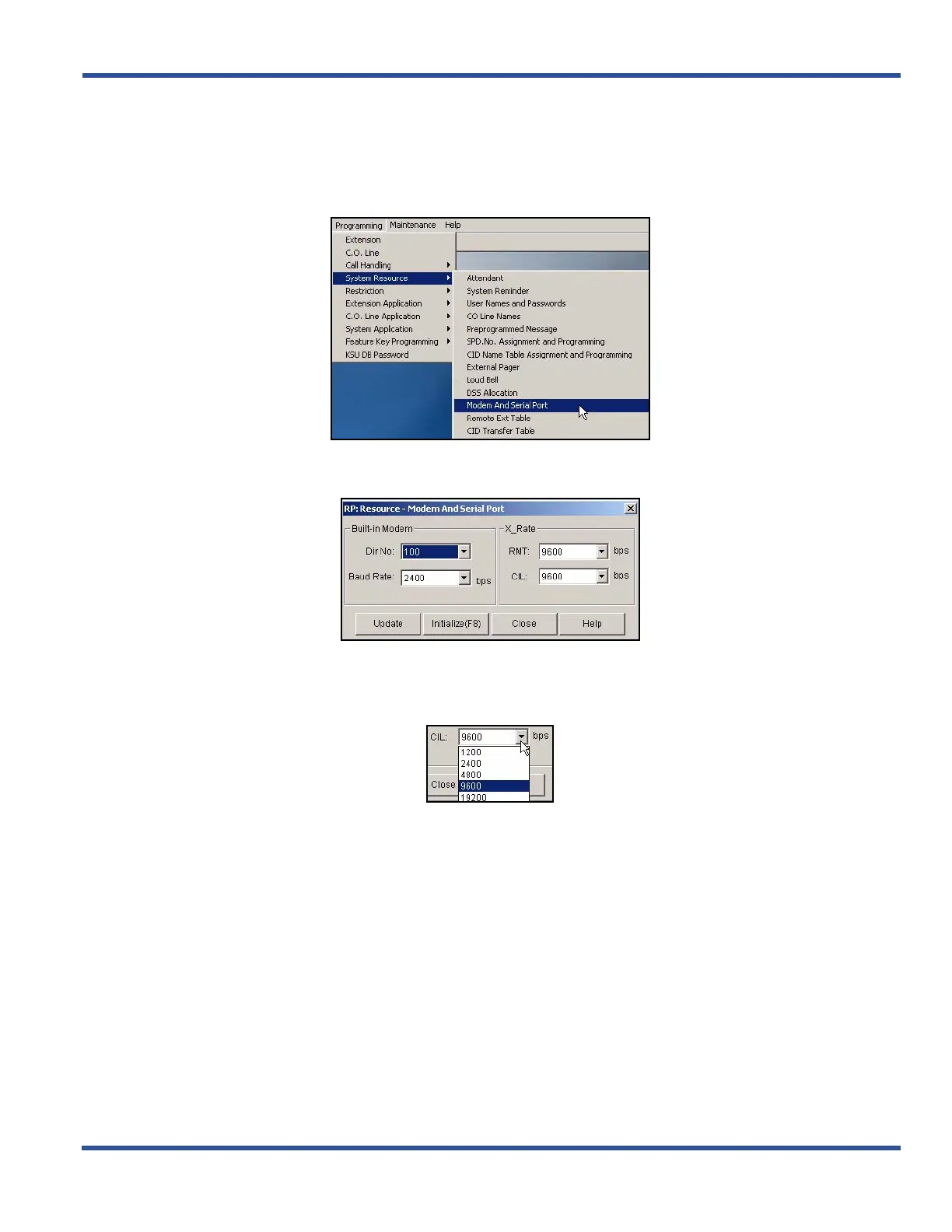 1) Go to ProgrammingXSystem ResourceXModem and Serial Port to display the Modem and Serial Port