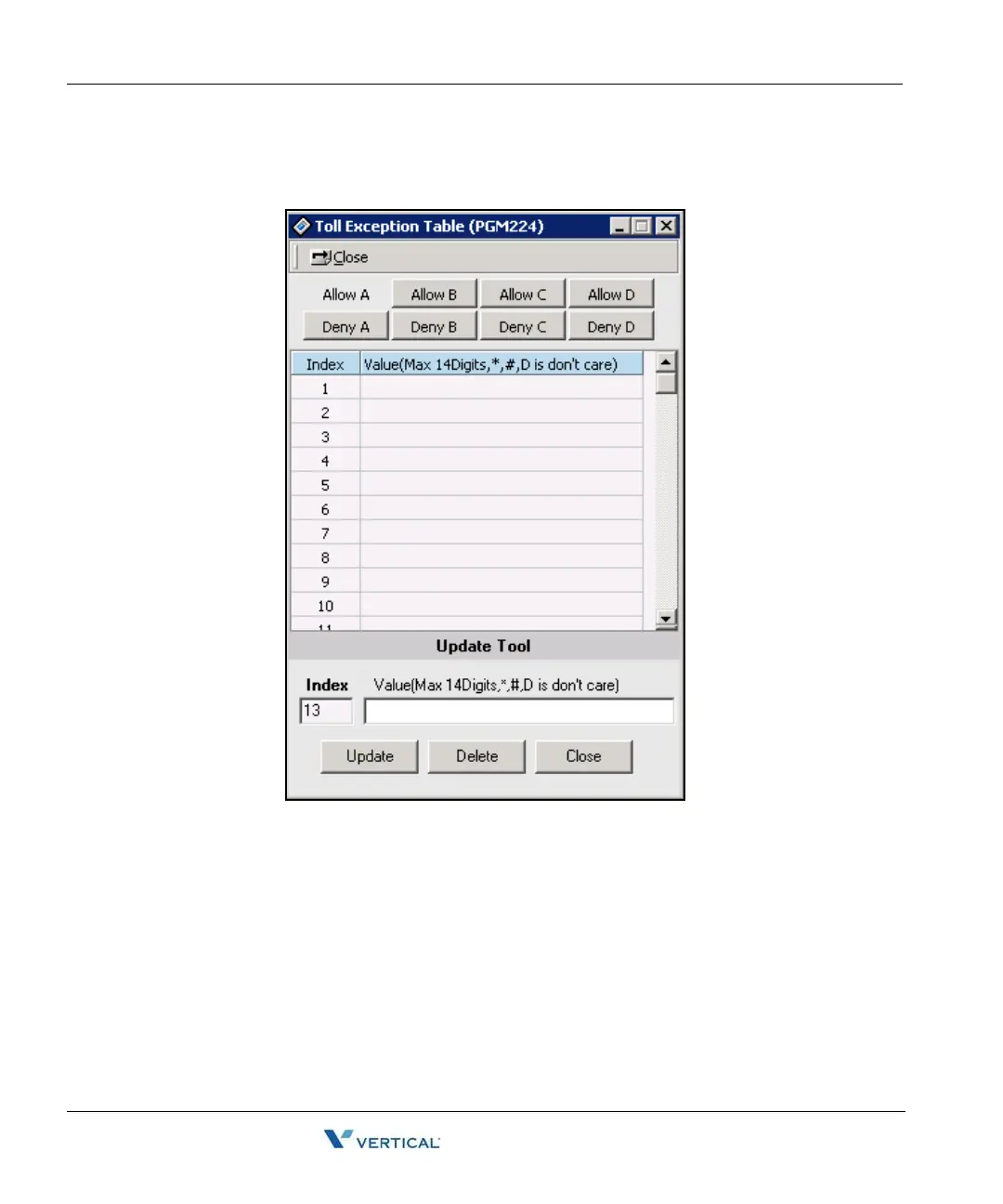Click [Toll Exception Table]. Select table (allow or deny).