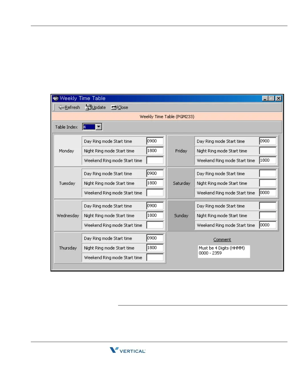 You can set day/night/weekend start time for each day. A total of 15 entries are possible.