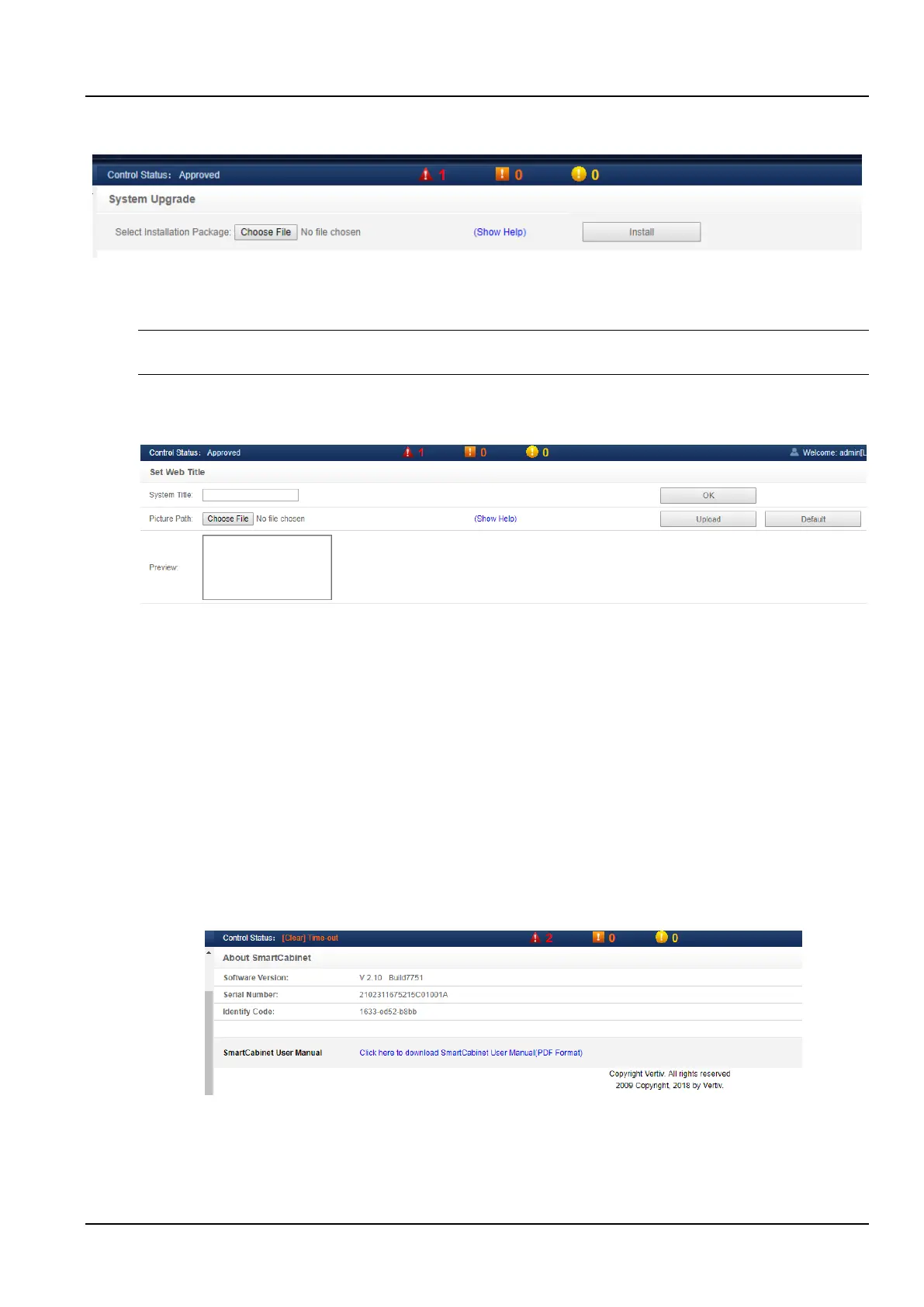 The “About SmartCabinet” page displays the intelligent monitoring system Software version, Serial number,