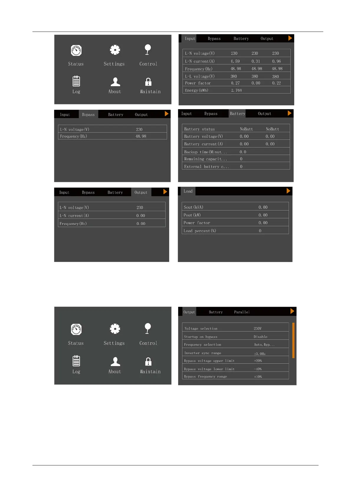 tings page can be used to access the Output, Battery, Parallel, Monitor, System, and Outlet settings. For