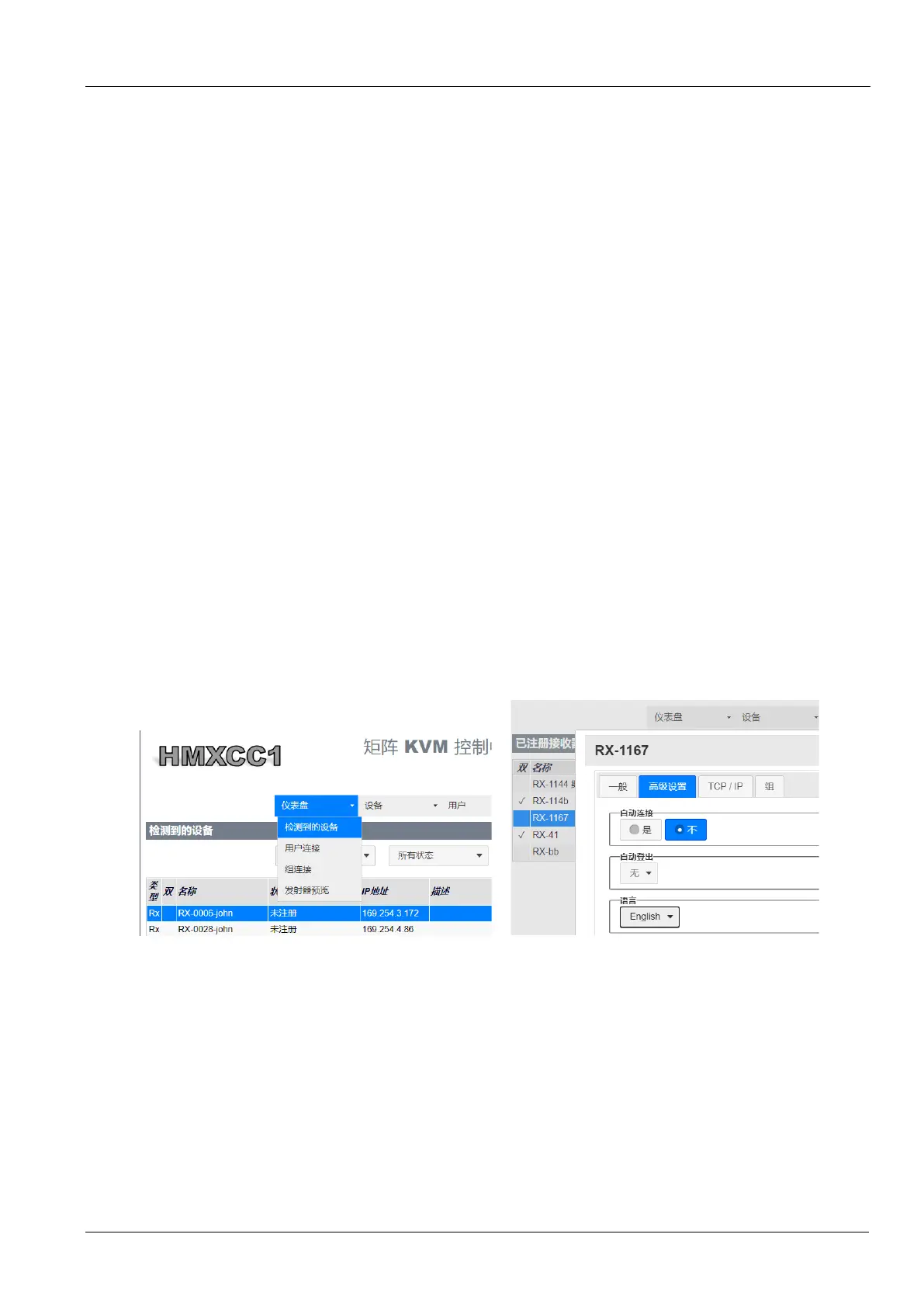 管理界面更改语言操作界面需到 HMXCC1 控制中心的设备>>接收器>>设置中更改。请参阅 HMXCC1 手册的<仪表盘>