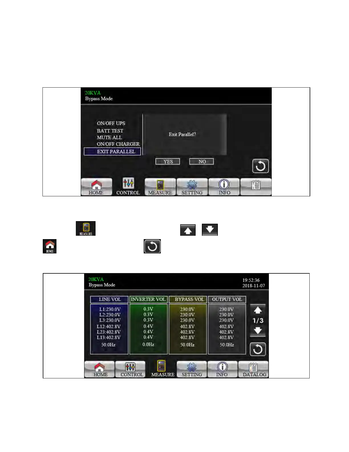 It will show “Exit Parallel?” when the units in parallel system. Touch “YES” to remove units from the parallel system. Or touch