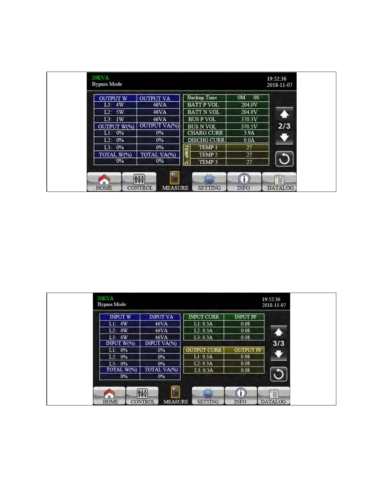 4. OUTPUT VA (%): L1, L2, and L3 output apparent power in percentage.