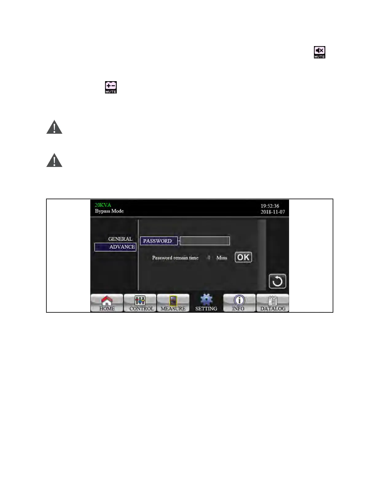 • Mode Mute: UPS status mode alarm enable/disable. If “Mode Mute” is activated, it will show icon