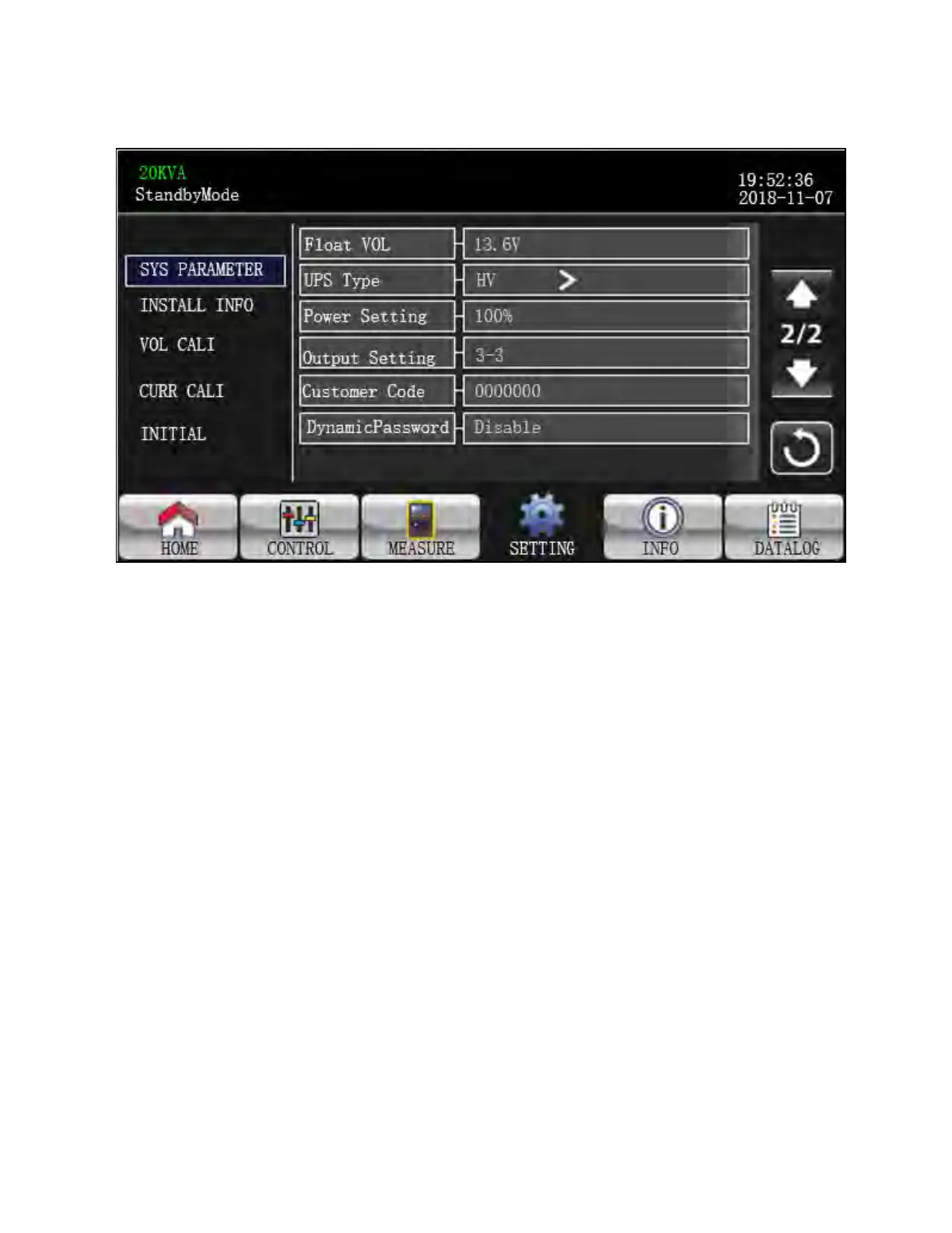 2. UPS Type: There are two options, HV and LV. This change is only allowed for qualified technician.