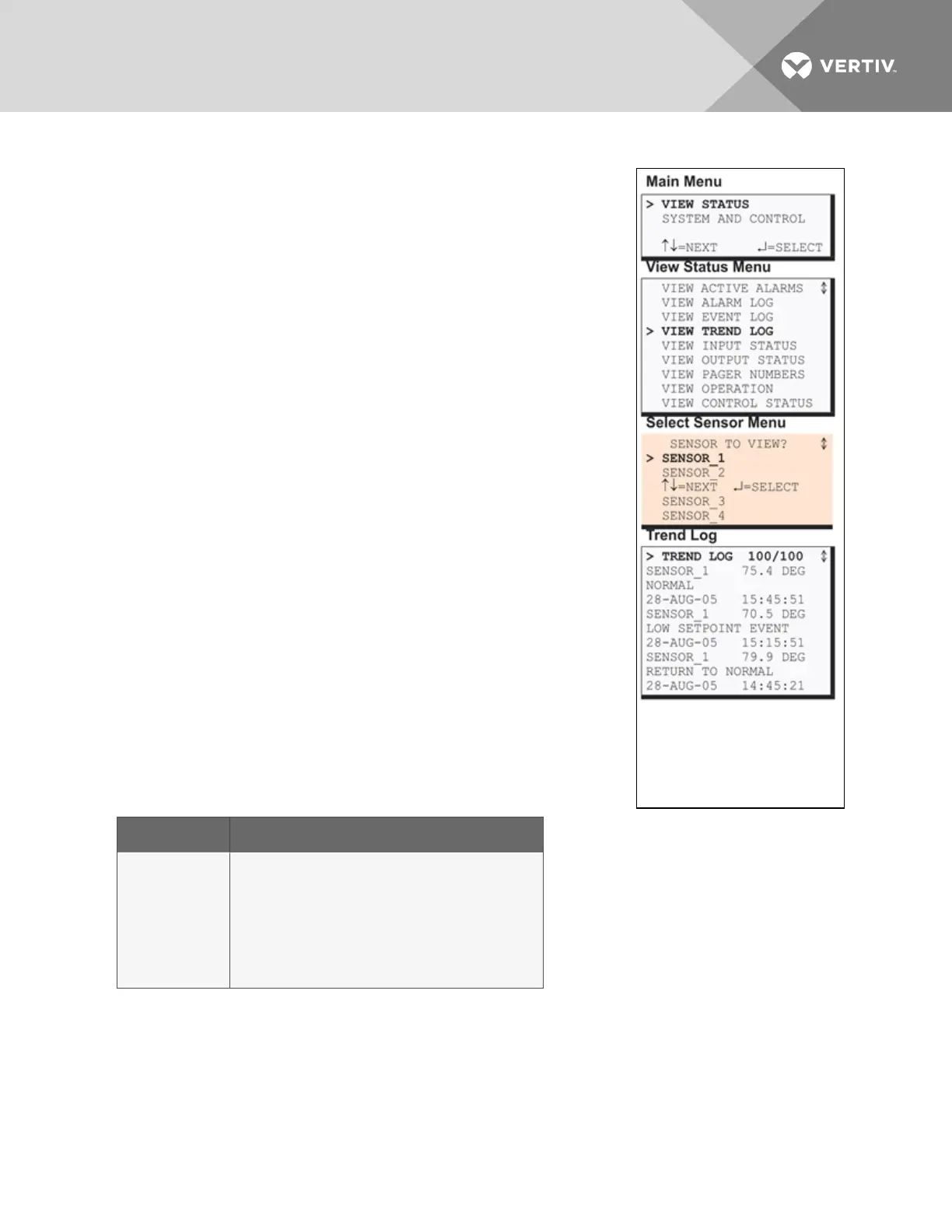 The Trend Log screen displays up to 100 records for the selected sensor. If
