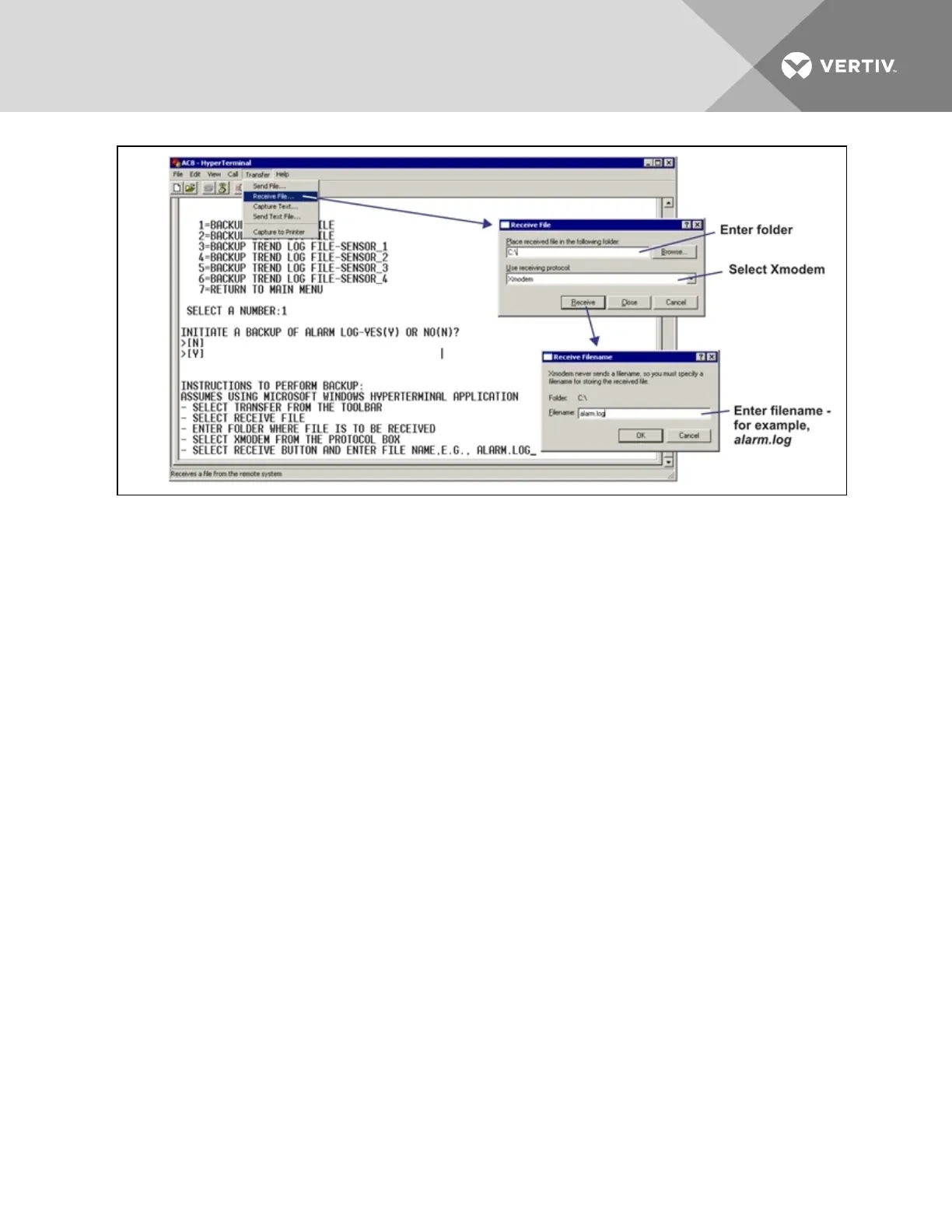 7. In the Receive Filename window, enter a name for the log file—alarm.log in the example above.