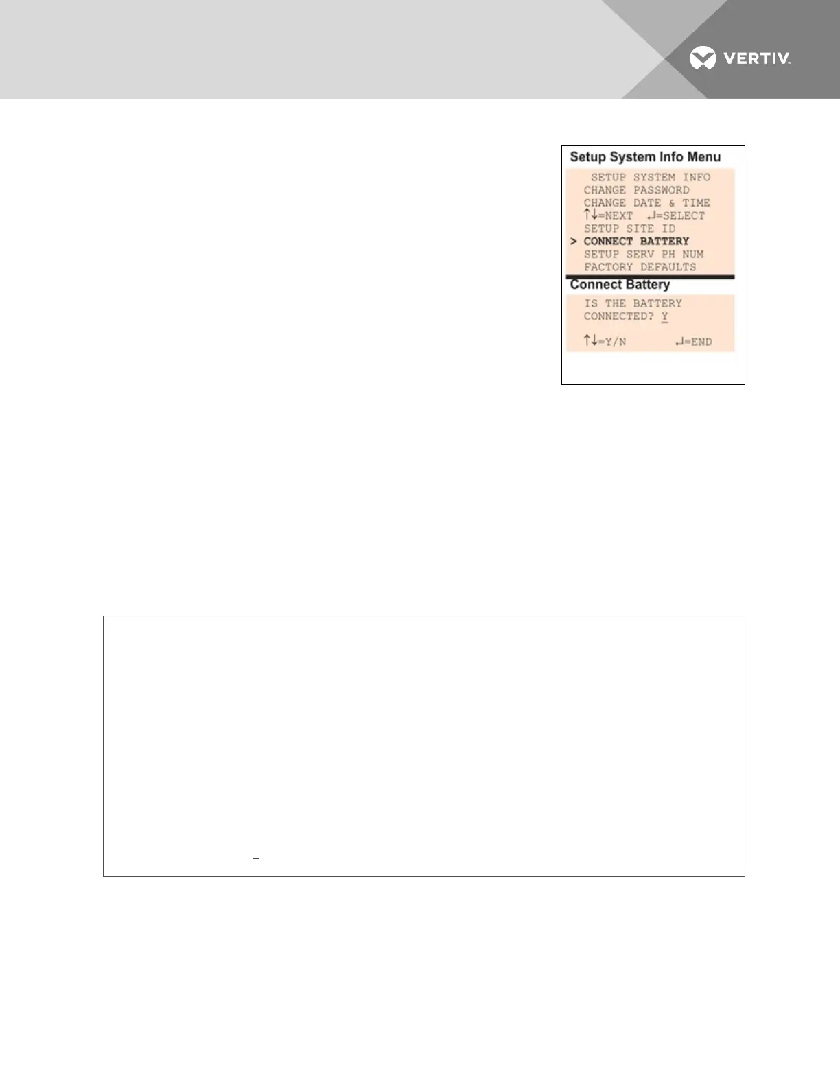 • Use the arrows to choose Y (Yes - the battery is connected) or N