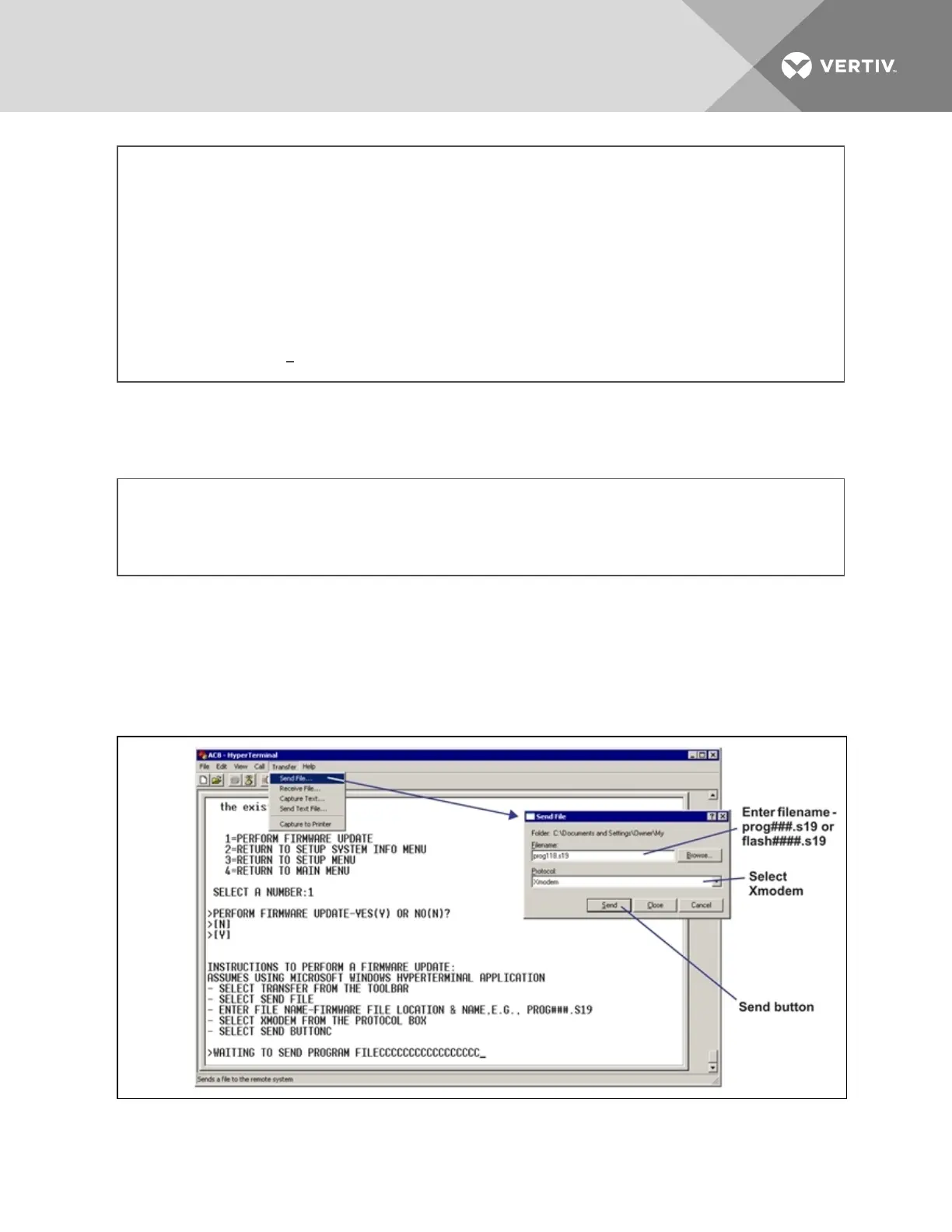 a. At the top of the HyperTerminal window, shown below, click on Transfer, then on Send