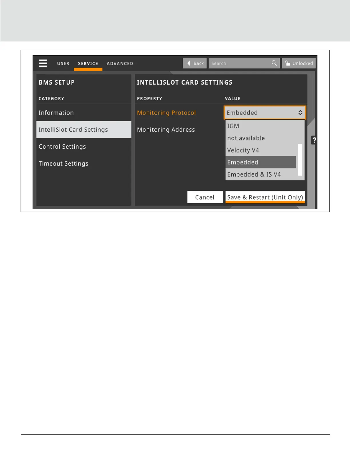 username/password, from the Service Menu, navigate to BMS & Teamwork Setup > IS-Unity Setup and tap the icon in the