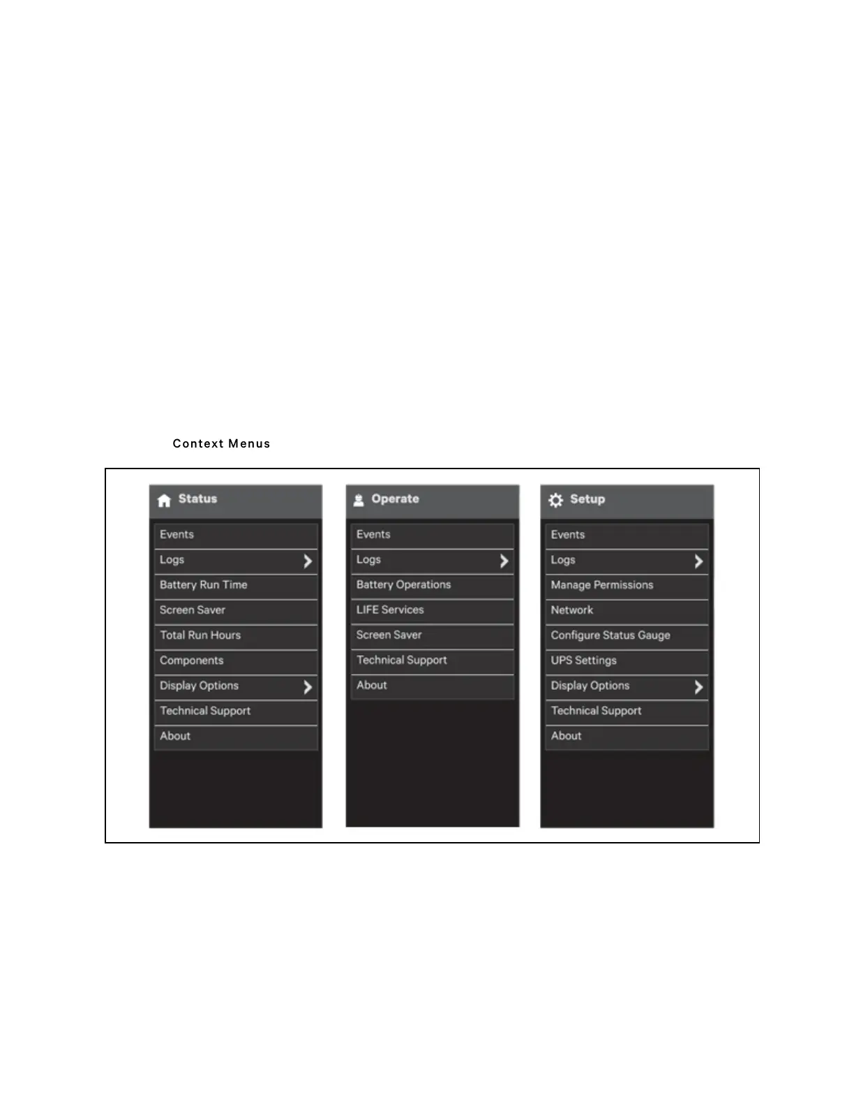 the Context Menu, such as alarms and run hours, are available through other areas of the Liebert® APM Plus Touchscreen
