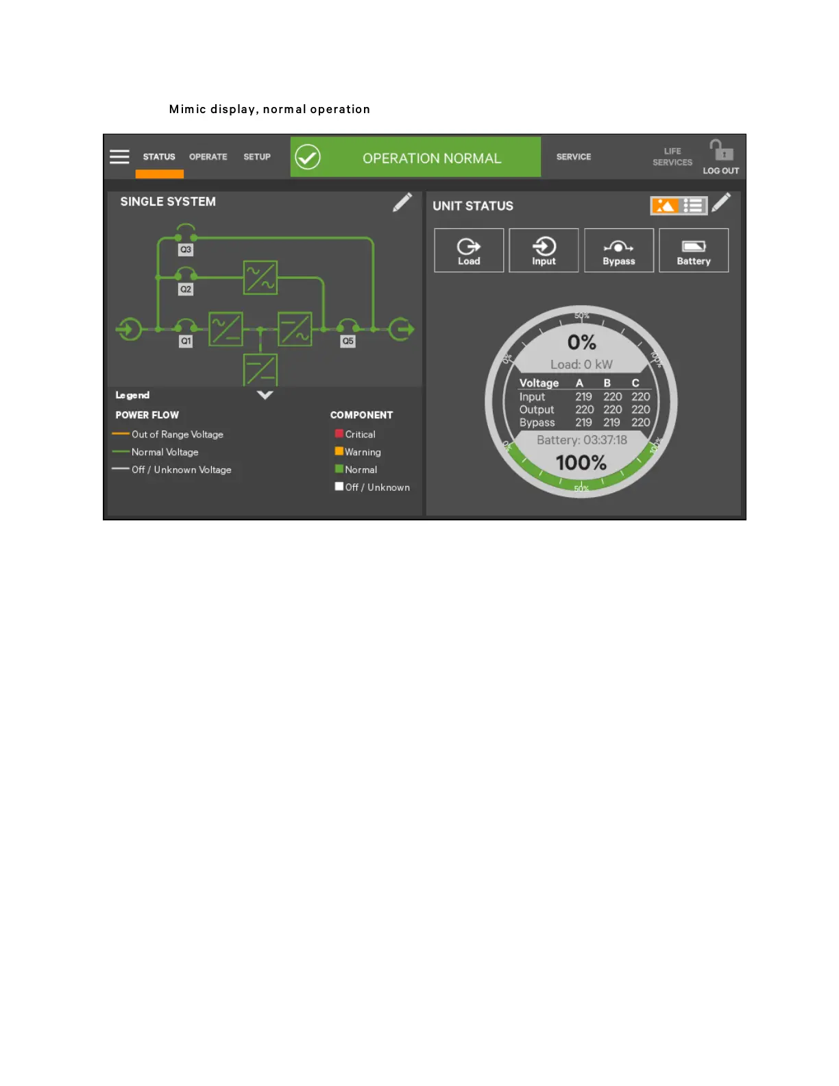 • Status Gauge-Connected load shown in kW and as a percentage of capacity; input, output, and bypass voltage