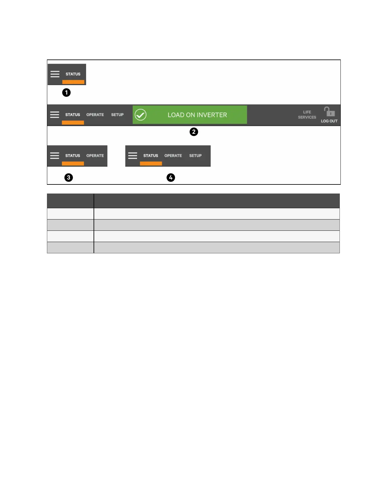 • OPERATE: UPS operation controls, such as inverter on, inverter off, energy saving status. Visible to Operator,