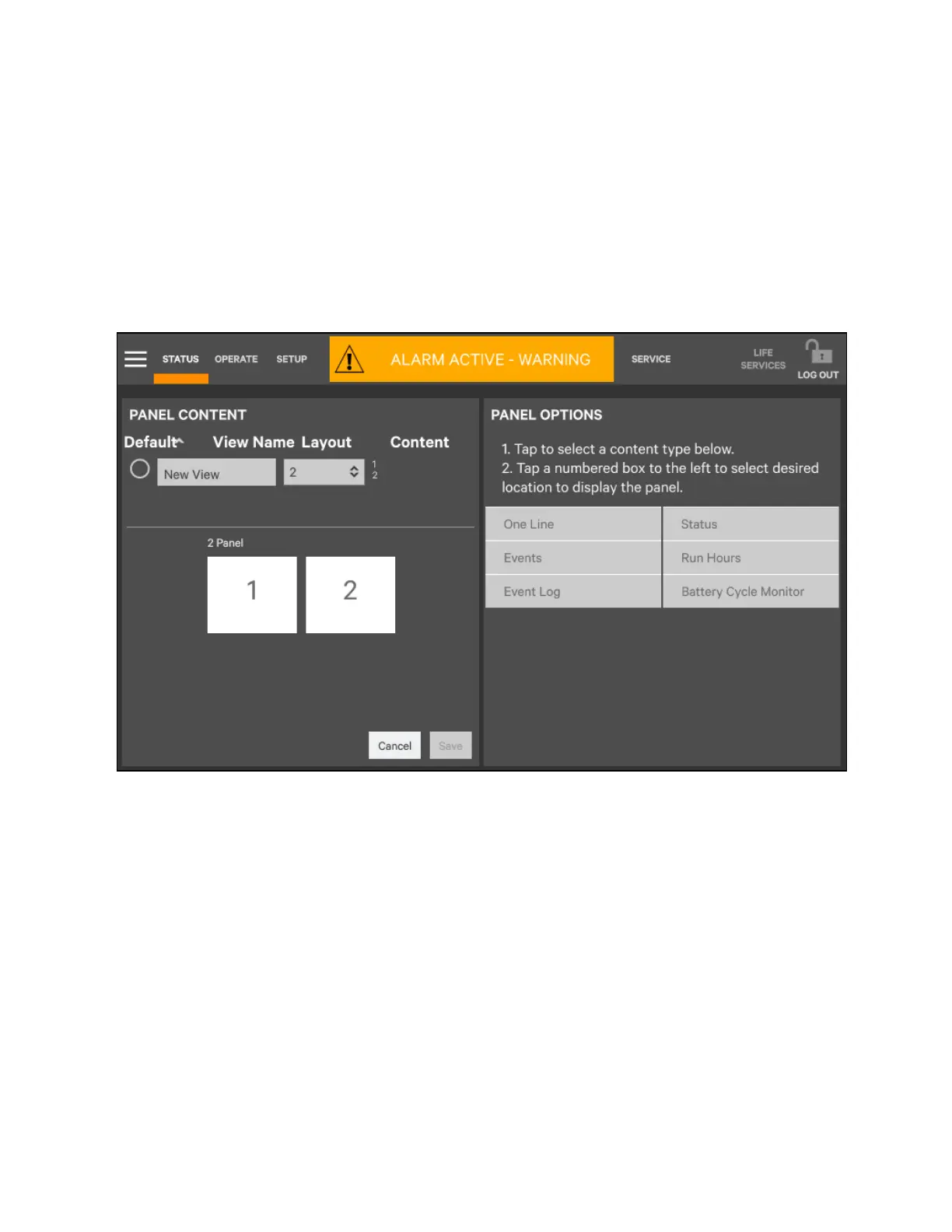 8. Choose the data to be displayed in each pane by touching a choice in the Panel options and then touching the