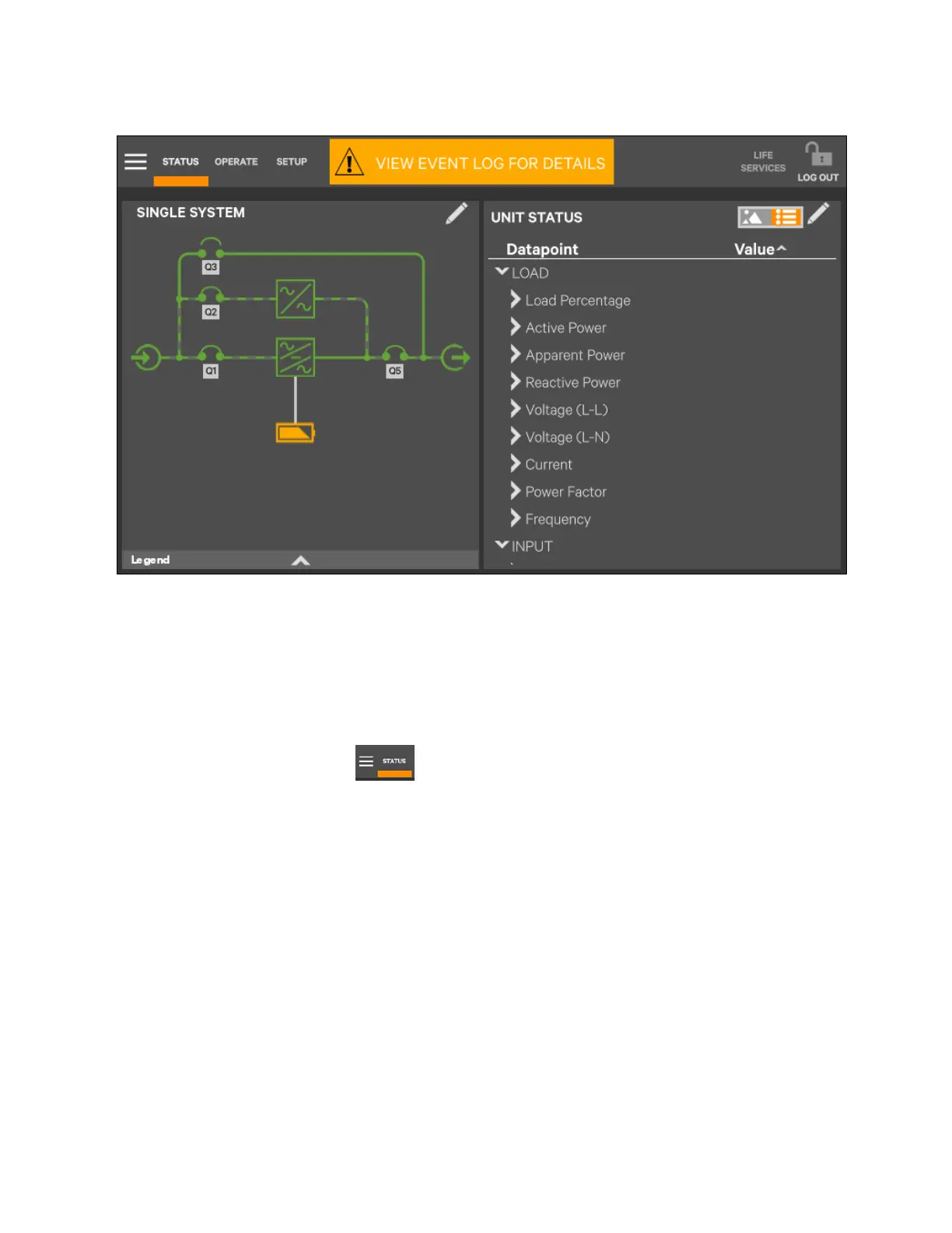 The Context Menu, when opened from the Status pane, permits viewing logs of alarms and events that have occurred on the