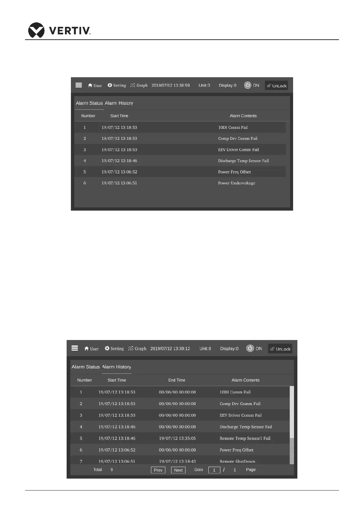 • The latest Alarm SN is the least number. Press the Up or Down button to scroll through the status