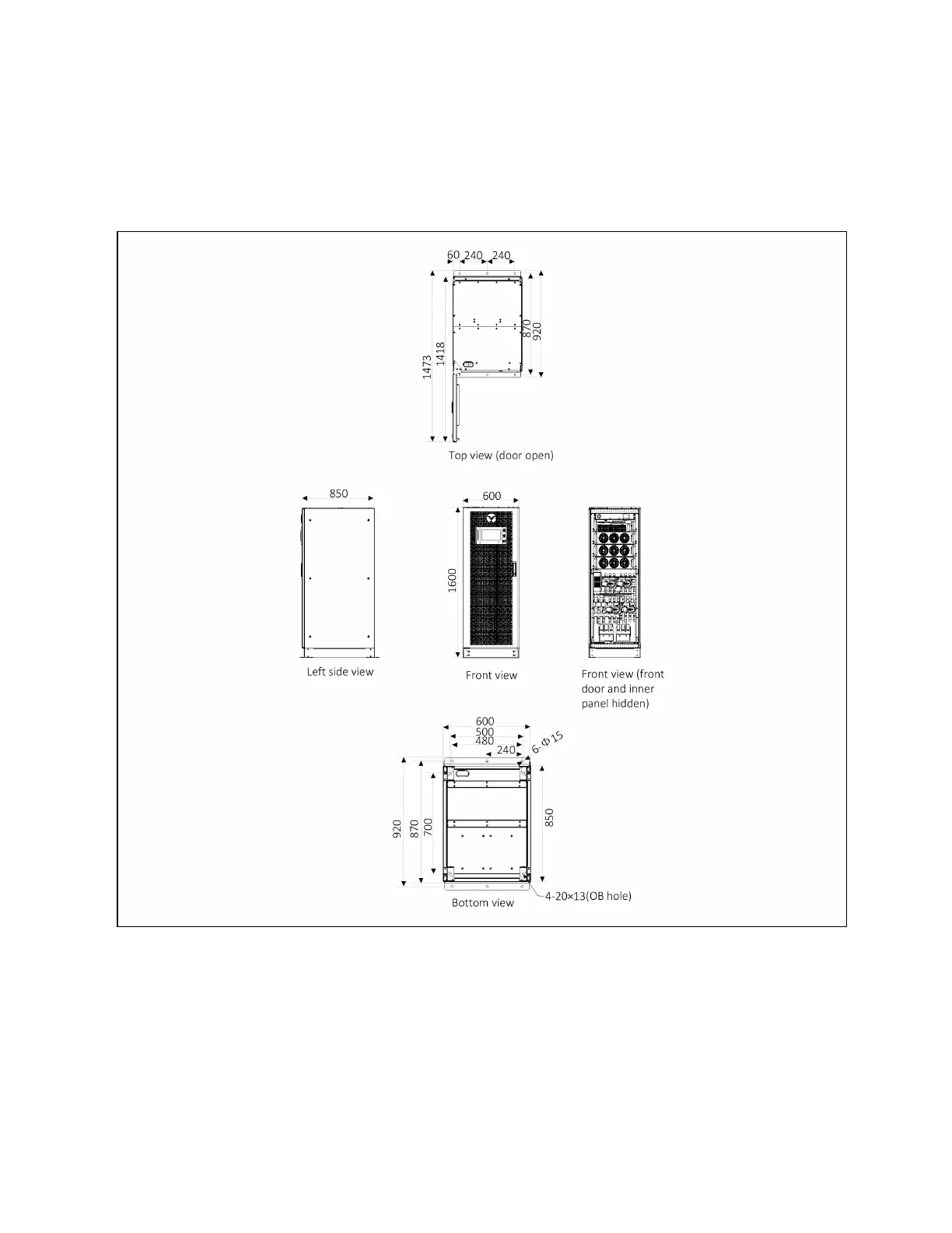 Figure 3.7 Top/front/side/b otto m view of the 100kVA ~250kV A U PS (unit: m m )