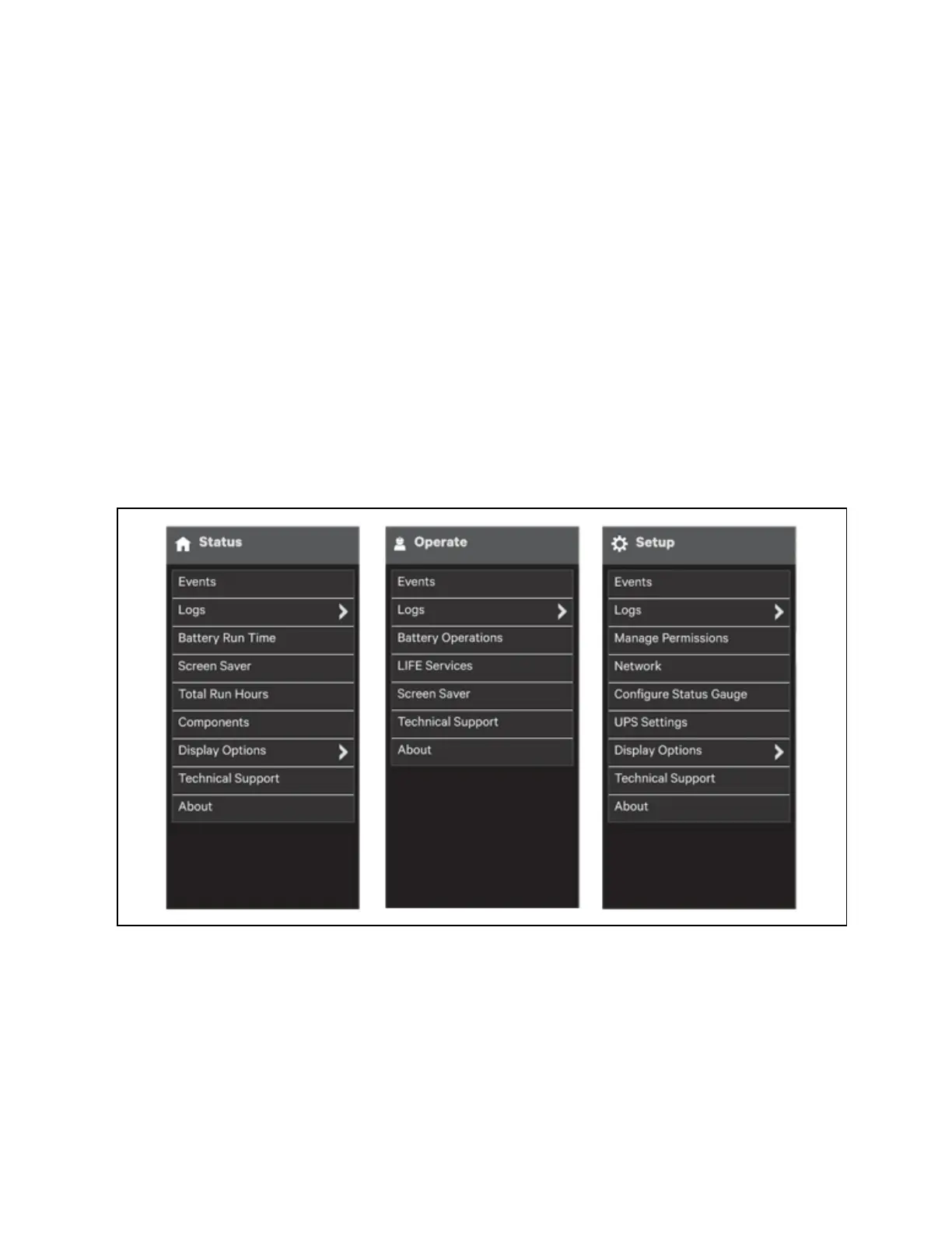 • O P ERA TE: UPS operation controls, such as inverter on, inverter off, energy saving status; visible to Operator,