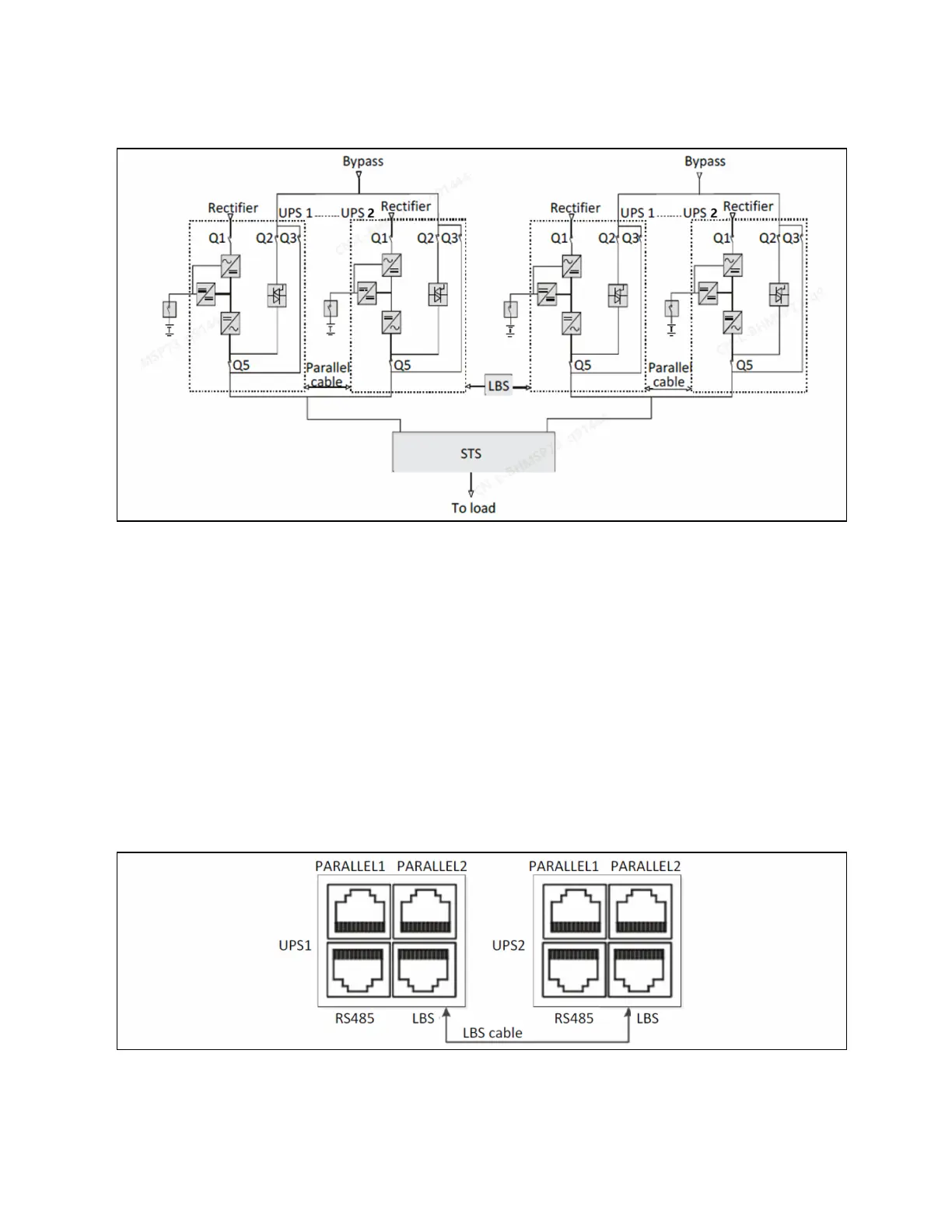 Connect the shielded and double insulated LBS optional cables (5 m, 10 m, and 15 m) between the LBS port of the two UPS