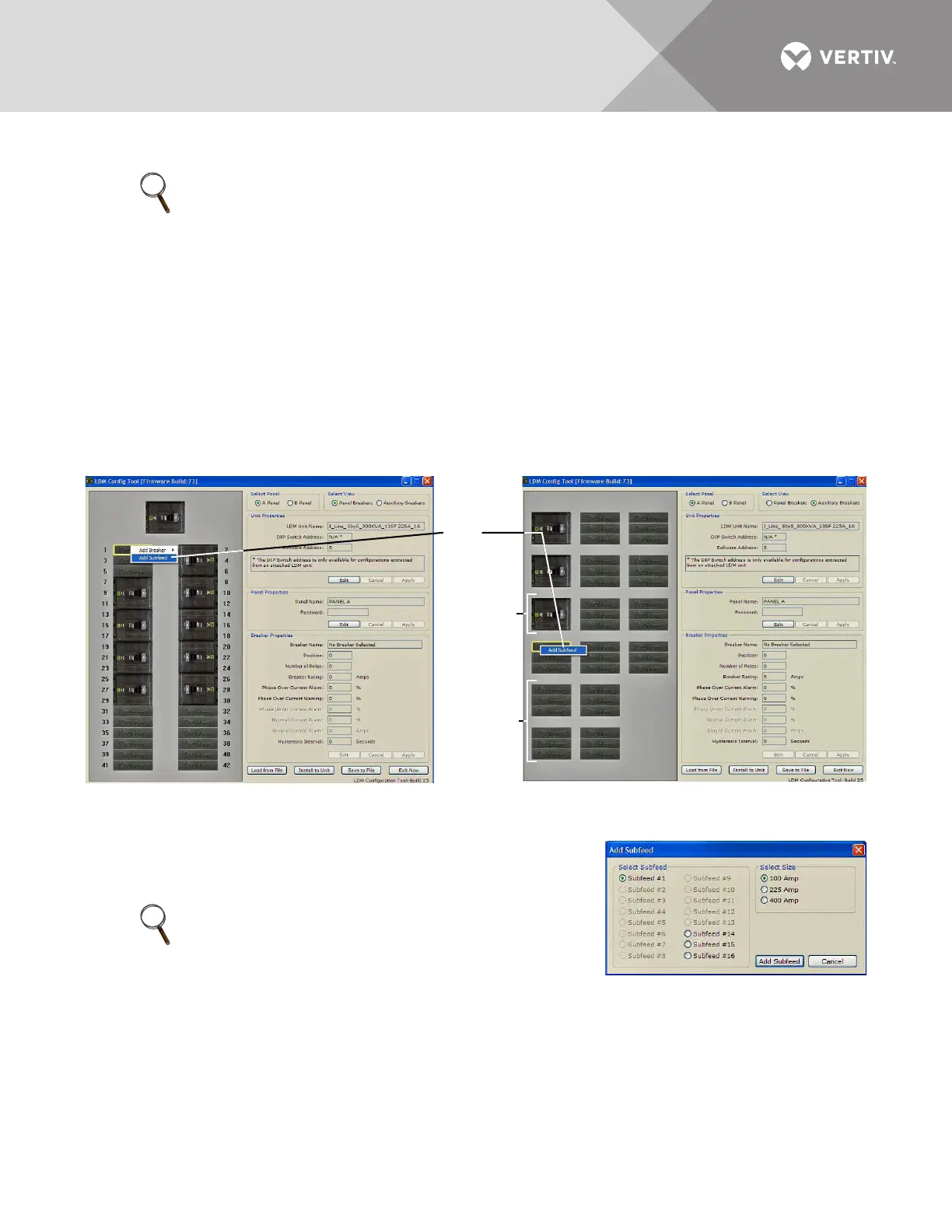 • If NOT assigned, a subfeed breaker position is shown with three Liebert logos.