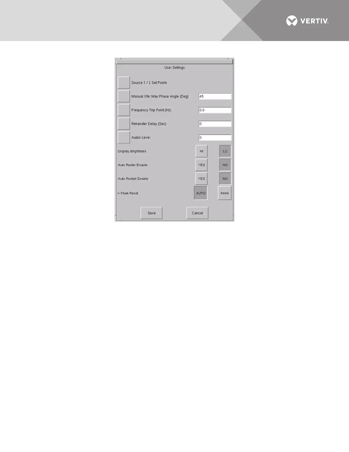 The Source 1/2 Set Points allows you to configure trigger points for each input source (1 or 2) for the Liebert