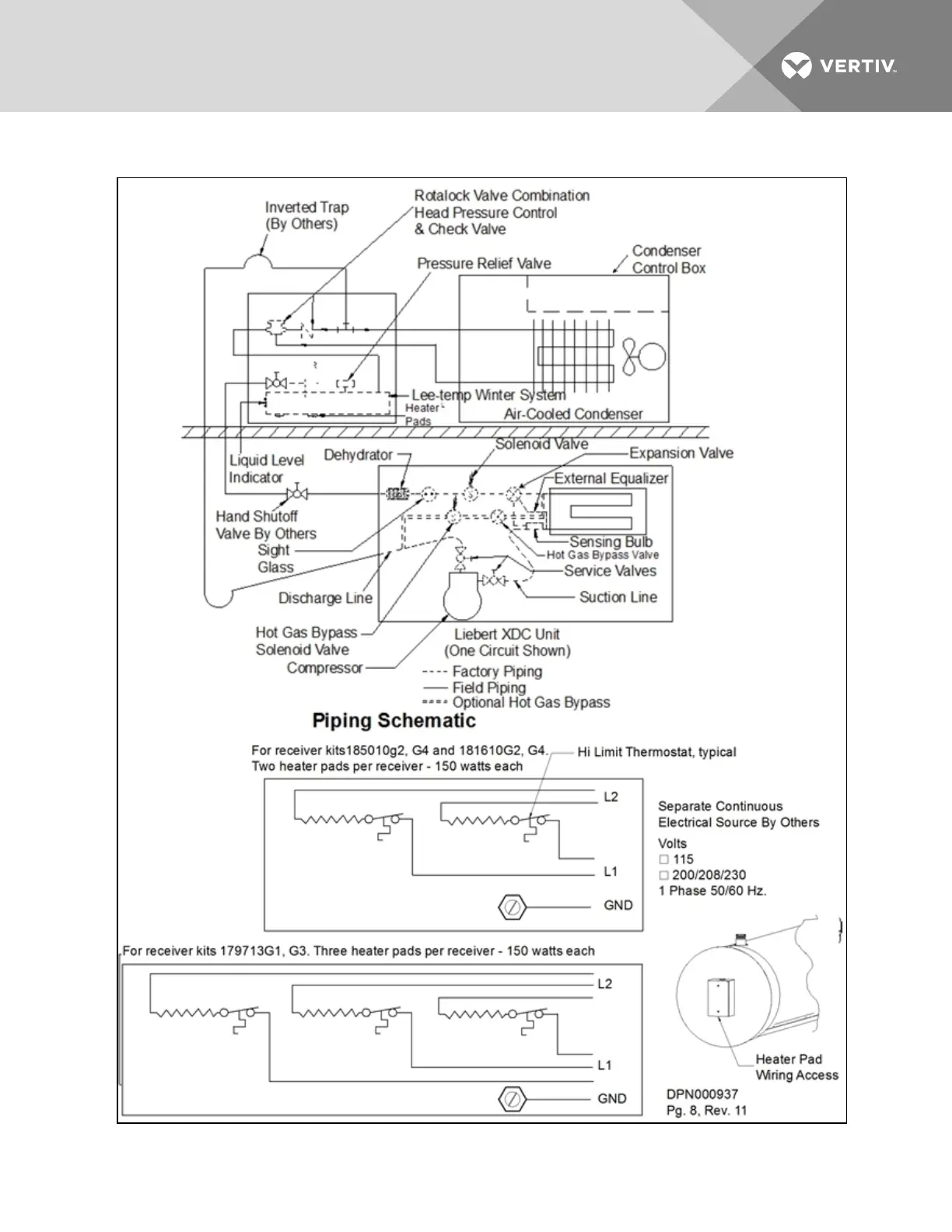 Figure 4.9 Liebert XDC piping schematic and Liebert Lee-Temp heater pad wiring