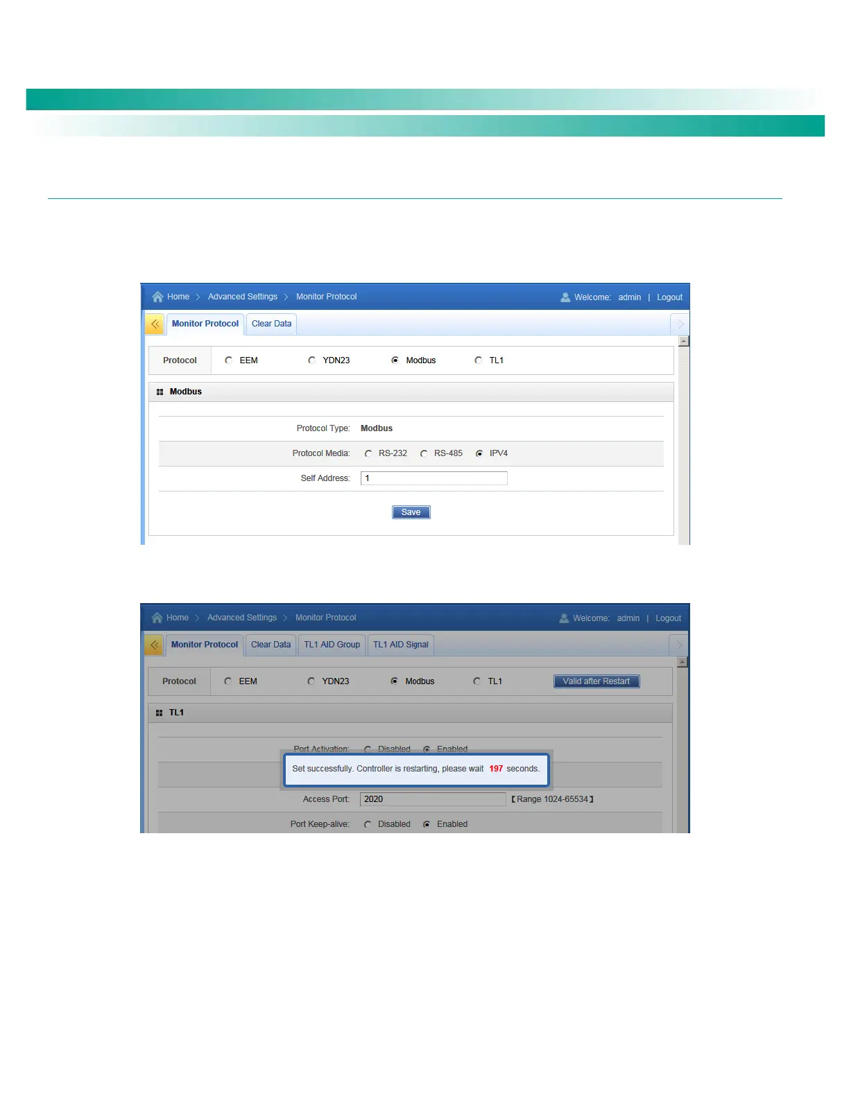 You can select "EEM", "YDN23", "Modbus" or “TL1” as the protocol. To make the new protocol valid, click the “Valid after Restart" button.