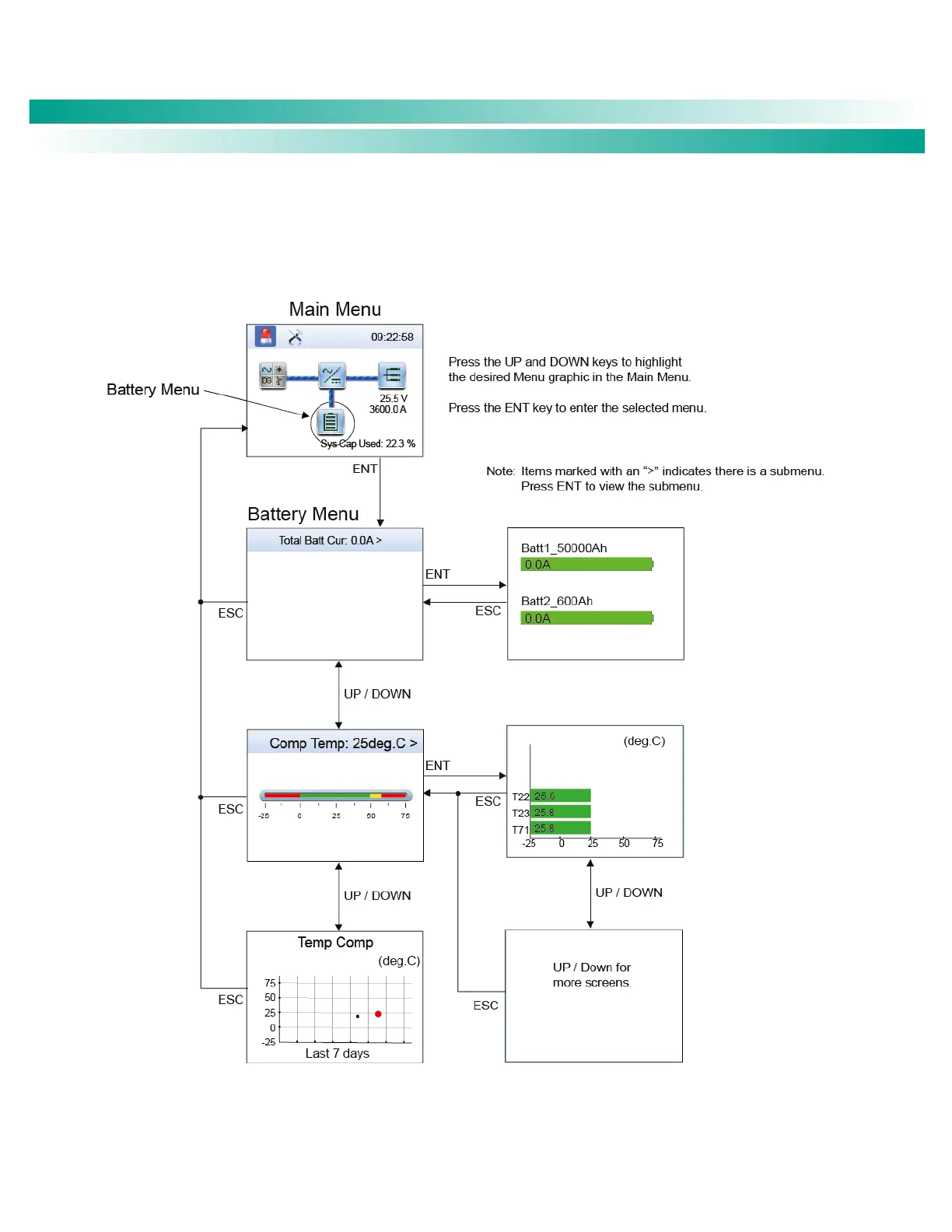 The Battery Menu can be accessed from the Main Menu as shown in Figure 19 or Figure 20. The actual display of the Battery Menu is