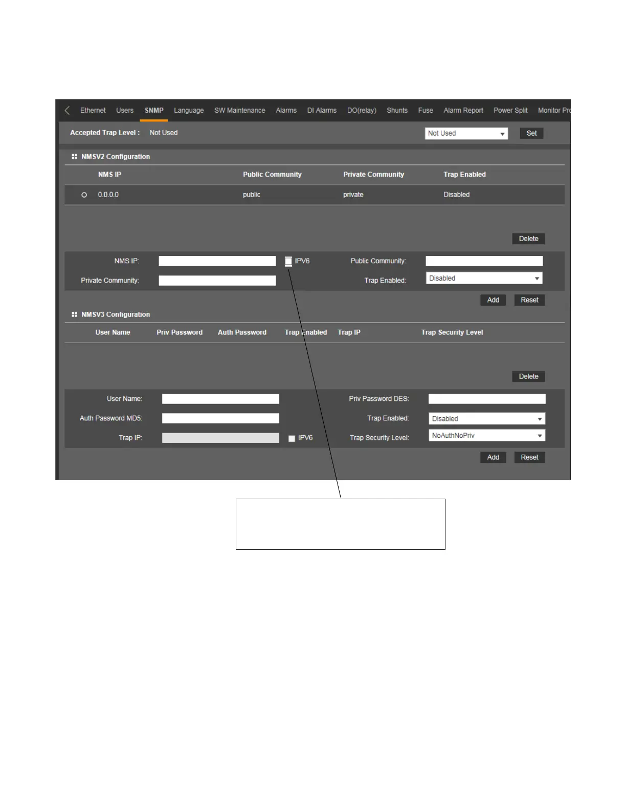 NMS IP. Check the IPV6 box when entering an