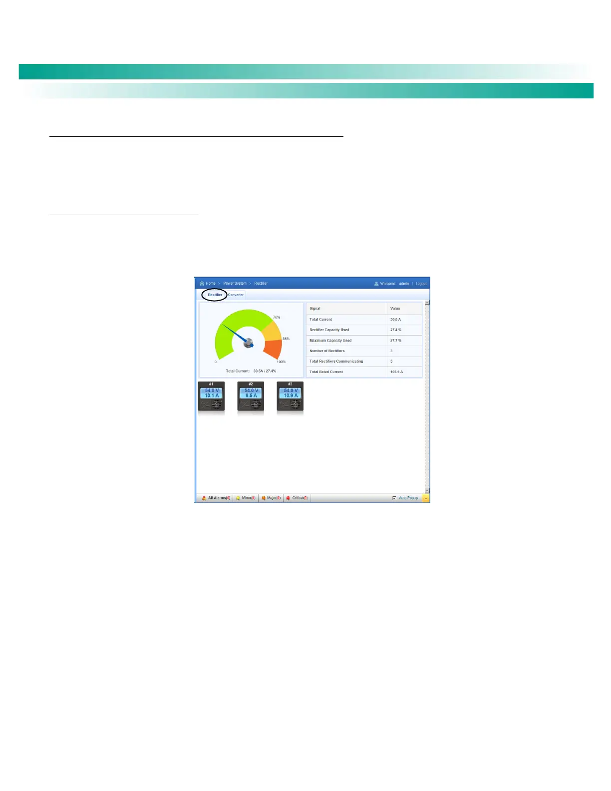 This tab displays status values such as “Total Current”, “Number of Rectifiers”, etc.