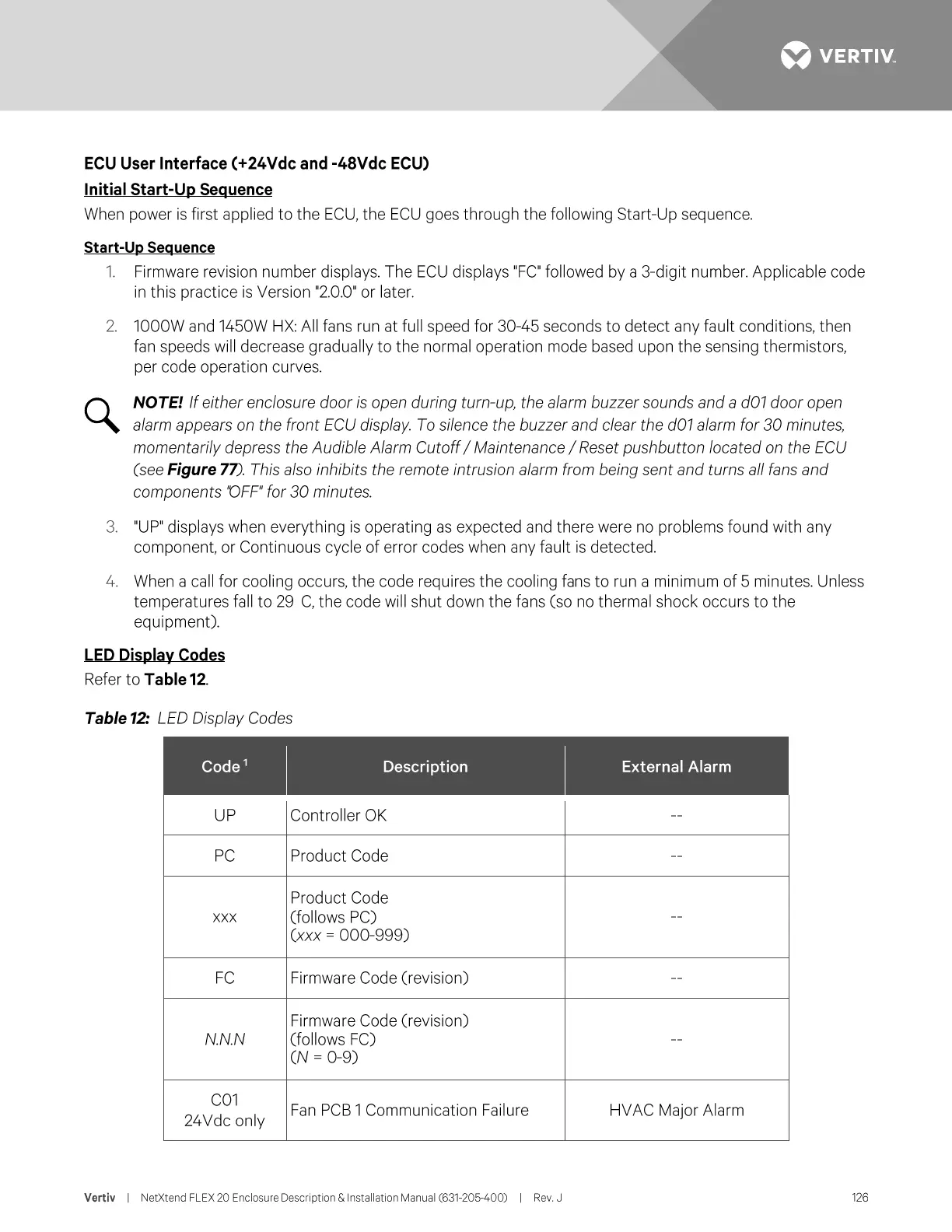 Vertiv NetXtend Flex 20 - ECU User Interface (+24 Vdc and -48 Vdc ECU); Initial Start-Up Sequence; Start-Up Sequence; LED Display Codes