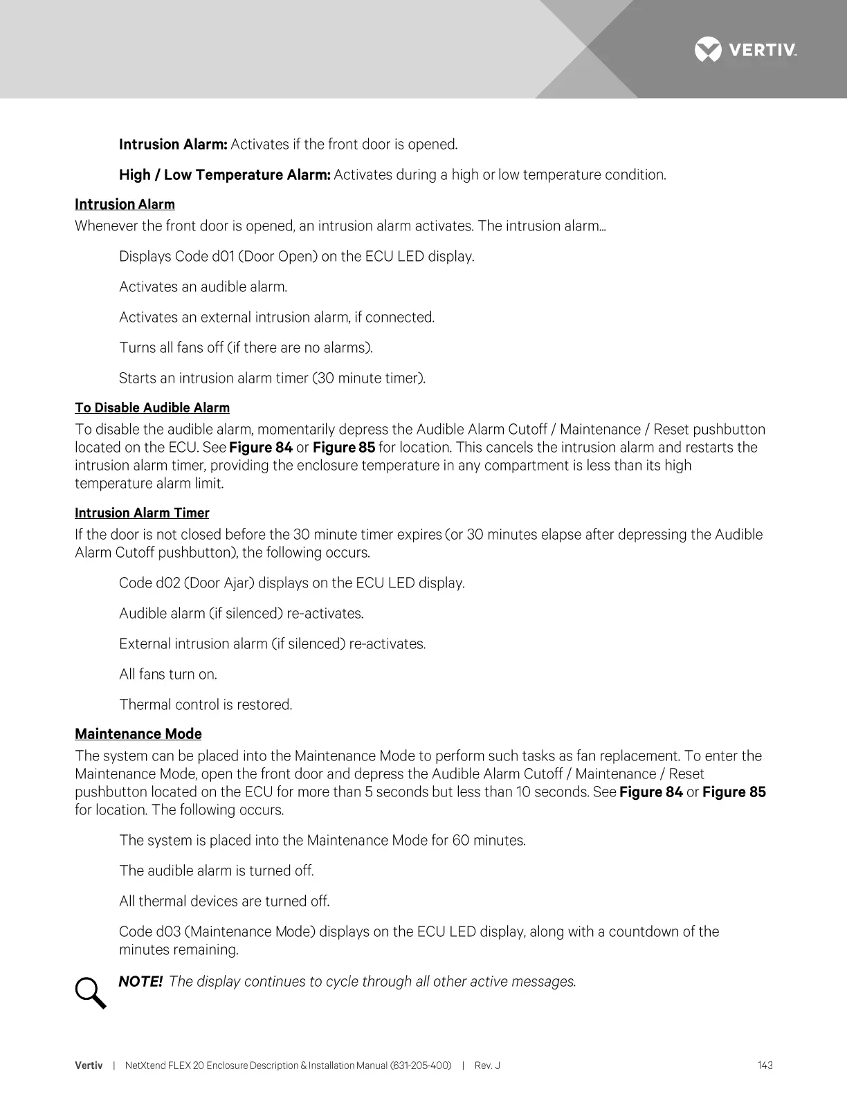 Vertiv NetXtend Flex 20 - Intrusion Alarm; To Disable Audible Alarm; Intrusion Alarm Timer; Maintenance Mode