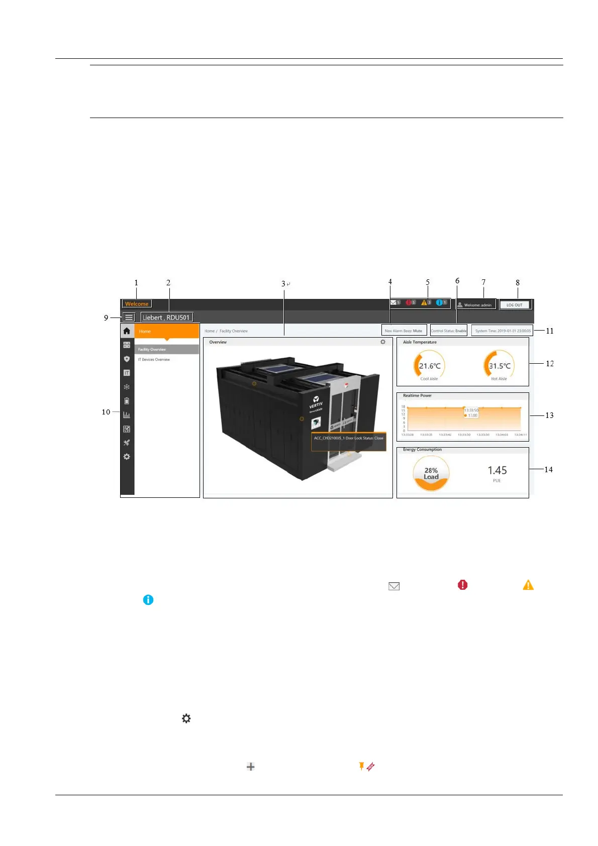The hot and cold aisle temperature displays the average temperature of cold and hot aisles in the module. For details