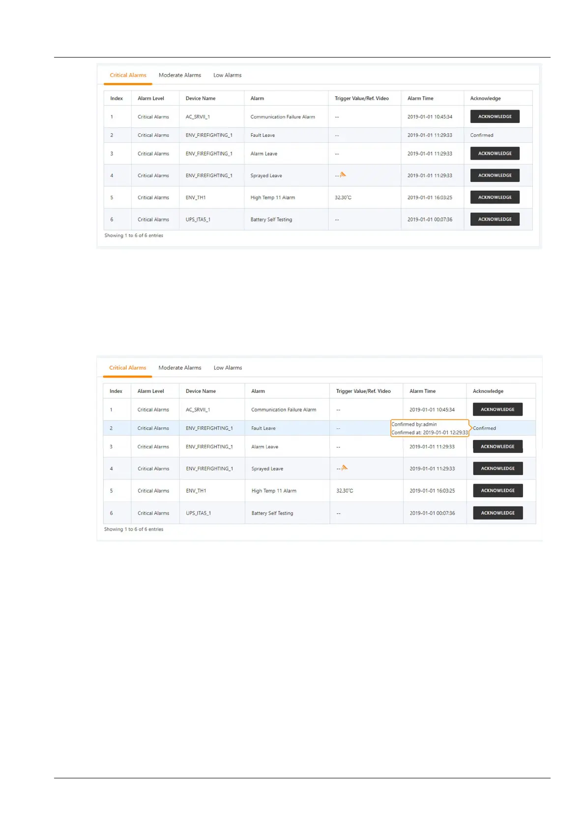 Click the Alarm confirmation button to confirm the alarm. The confirmed alarm will no longer participate in the