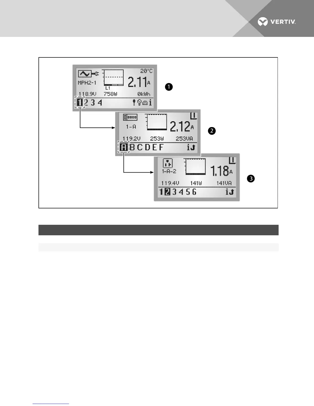 number in the lower-left corner indicates which component is currently displayed, for example PDU1, Branch A, Receptacle