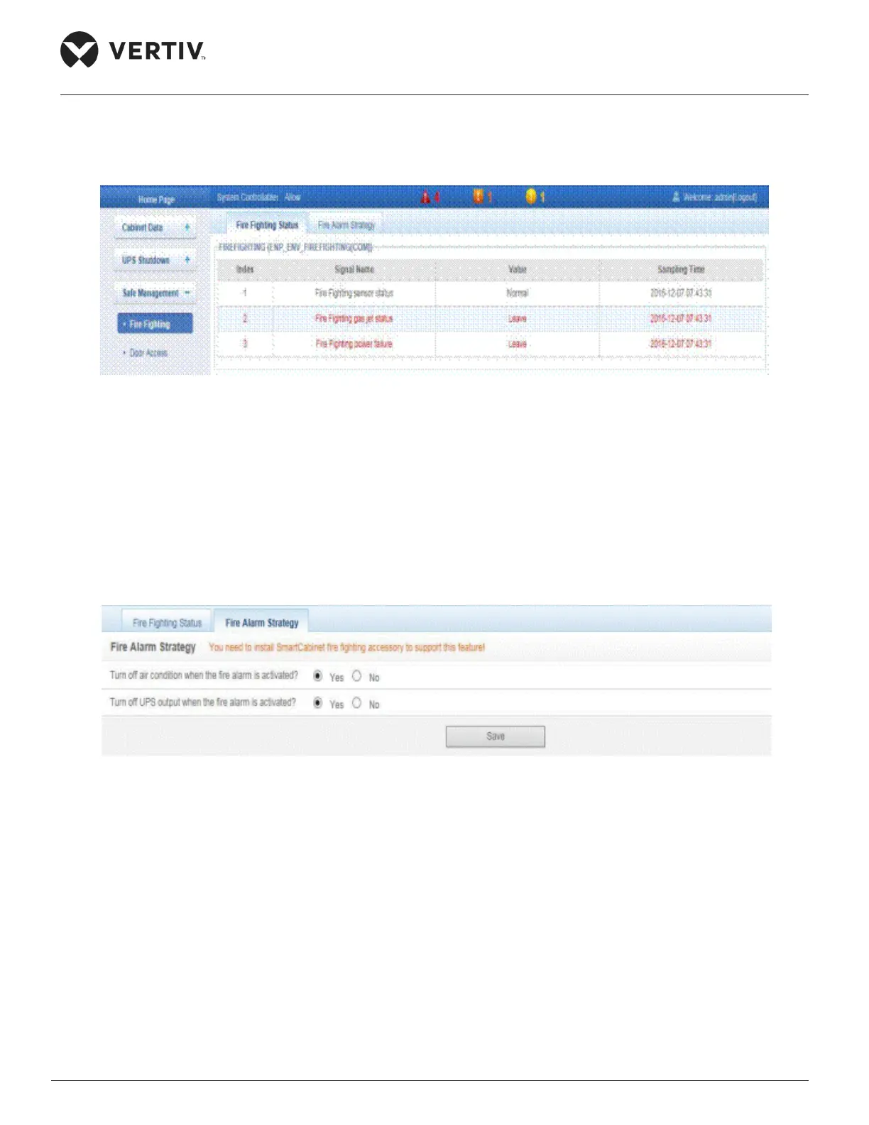 » The Fire Alarm Strategy tab is next to the Fire Fighting Status tab. The air conditioner and UPS