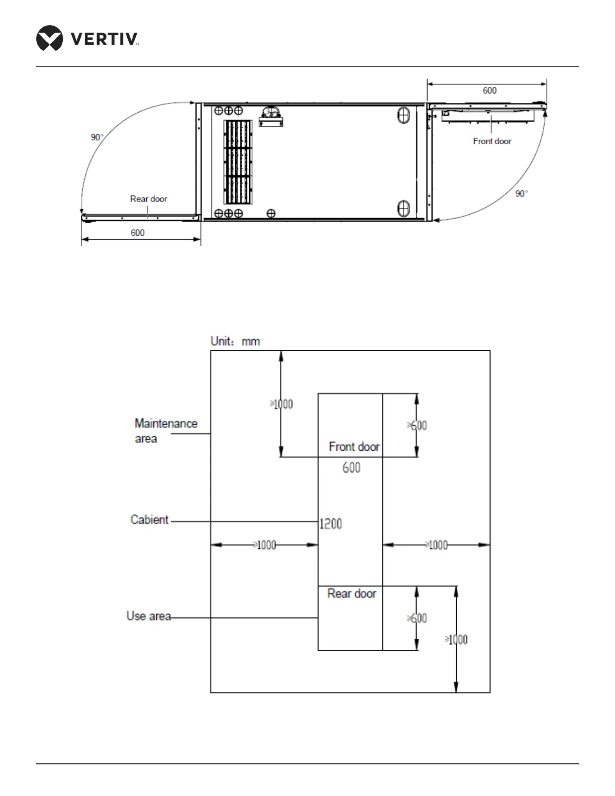 Figure 2-12 Required clearance for opening the front and rear door (Top view, unit: mm)