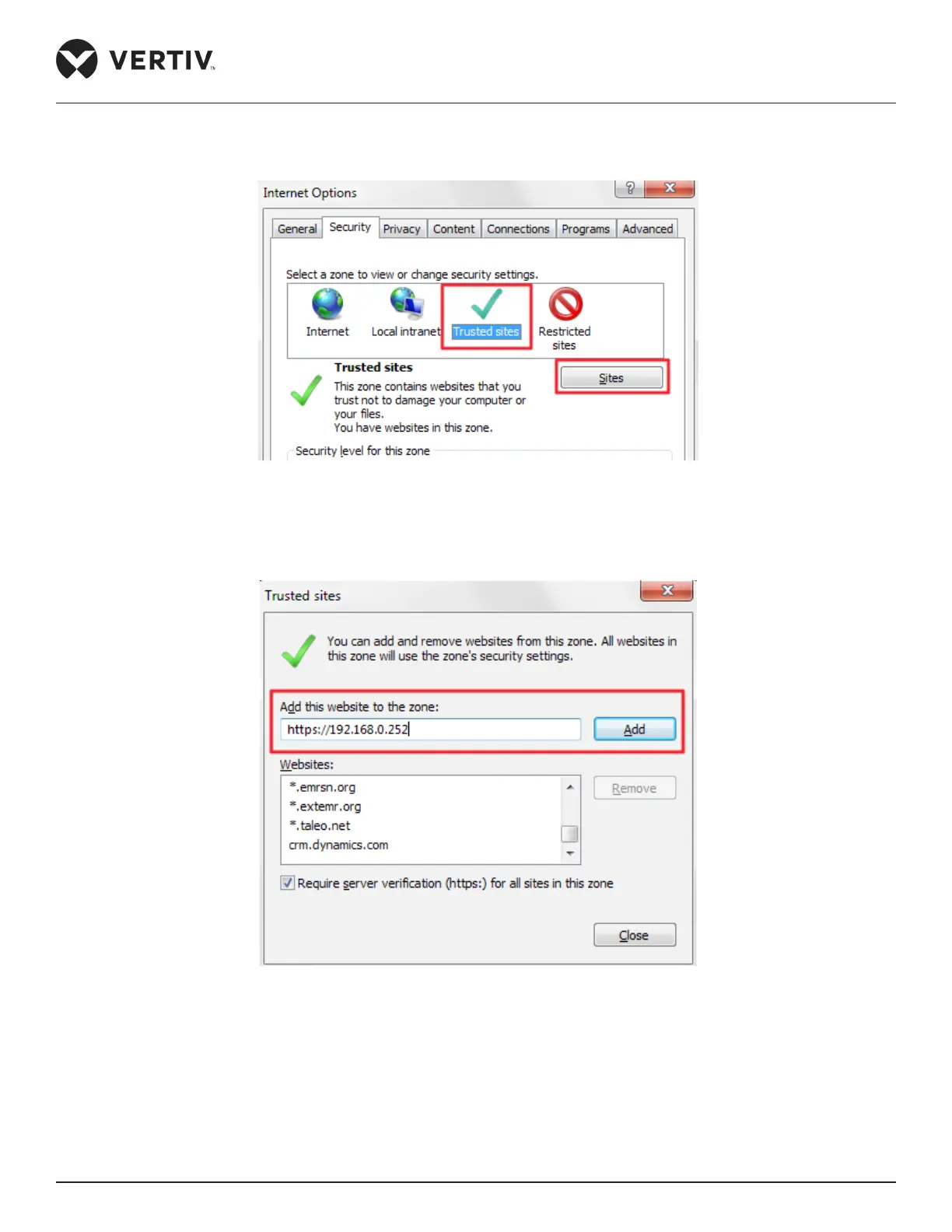 » Finally, the IP address of the MSC card needs to be added. Go back to Trusted Sites and click the Sites