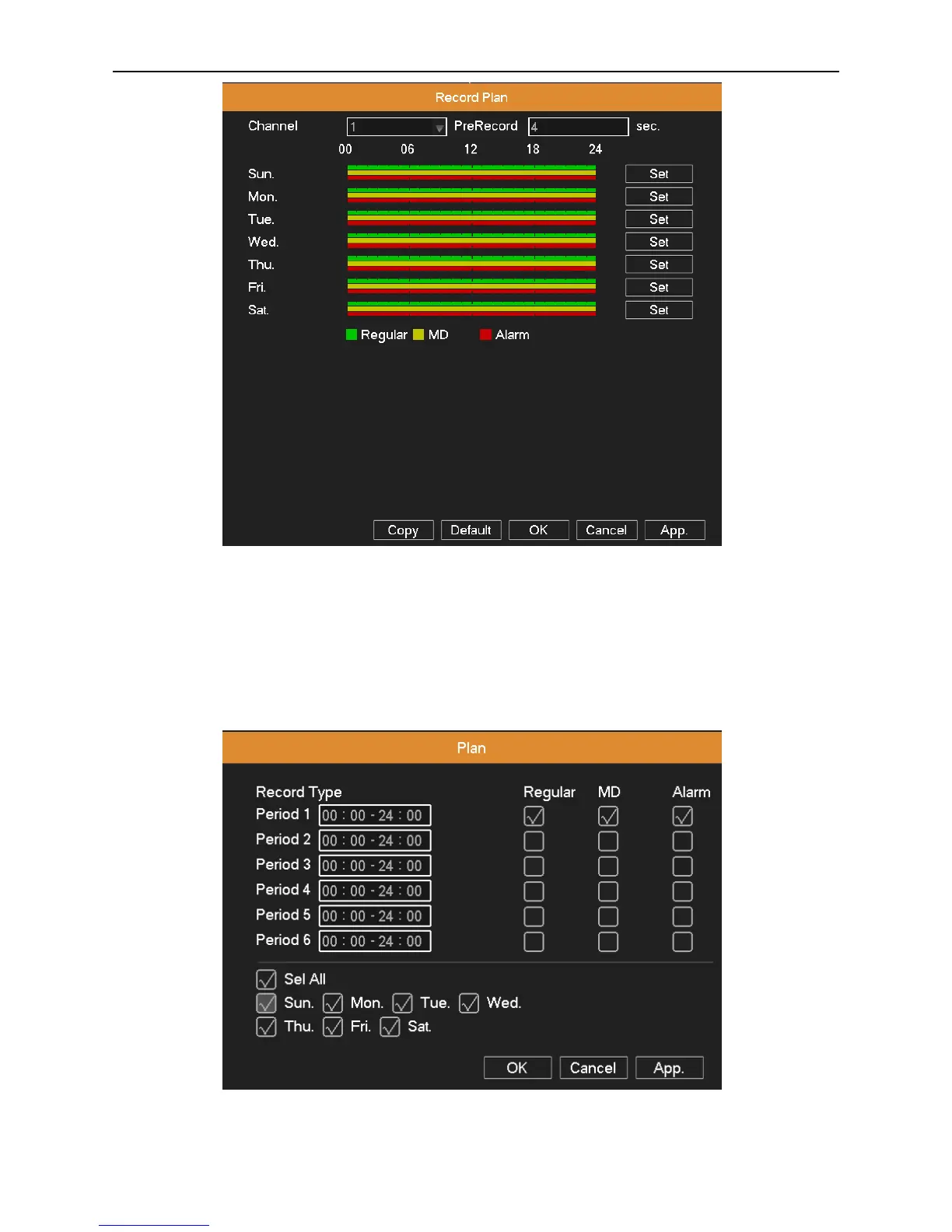Set: Click Set button to pop up the Plan window, select one day or all days of recording plan, set recording type and period,