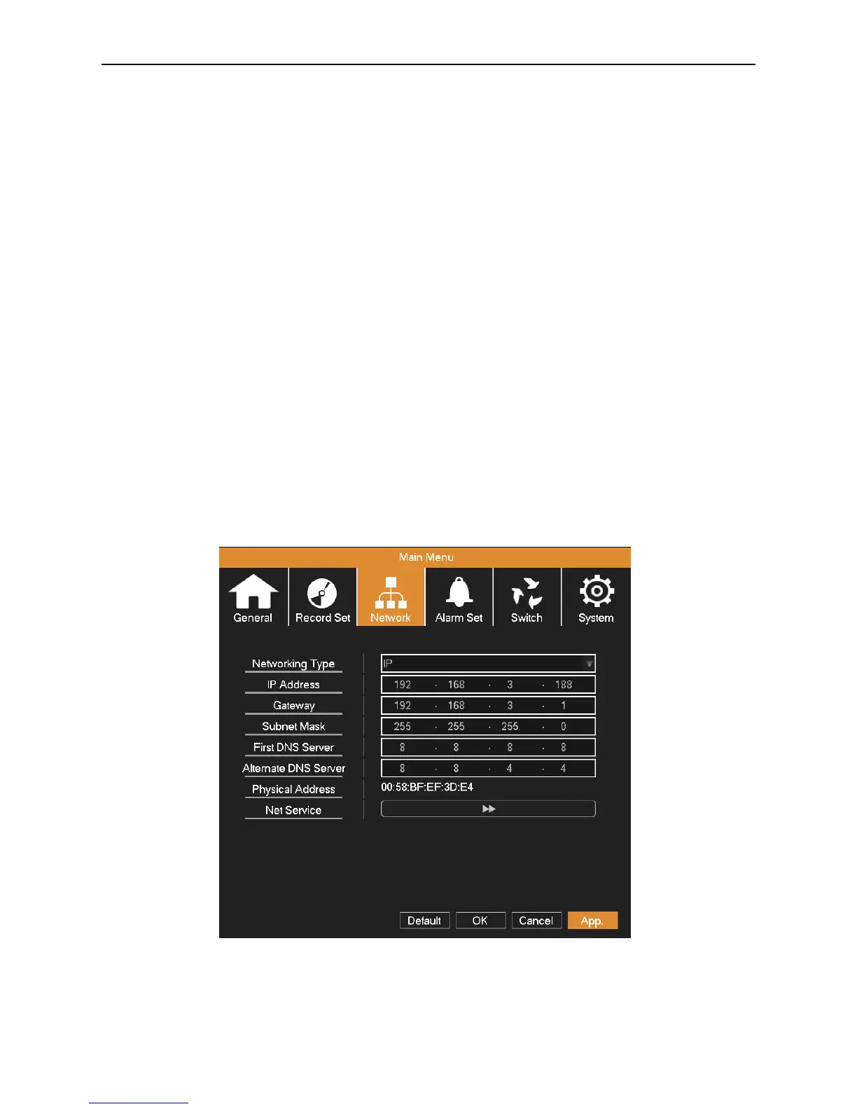 First DNS Server: Set the preferred DNS. Using DDNS function needs to set the address of DNS server as their local DNS