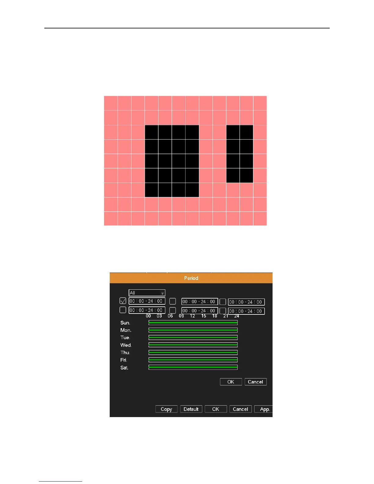 Period: Click Set button, select one day or all days of detection plan, set the time period (each day is divided into six time