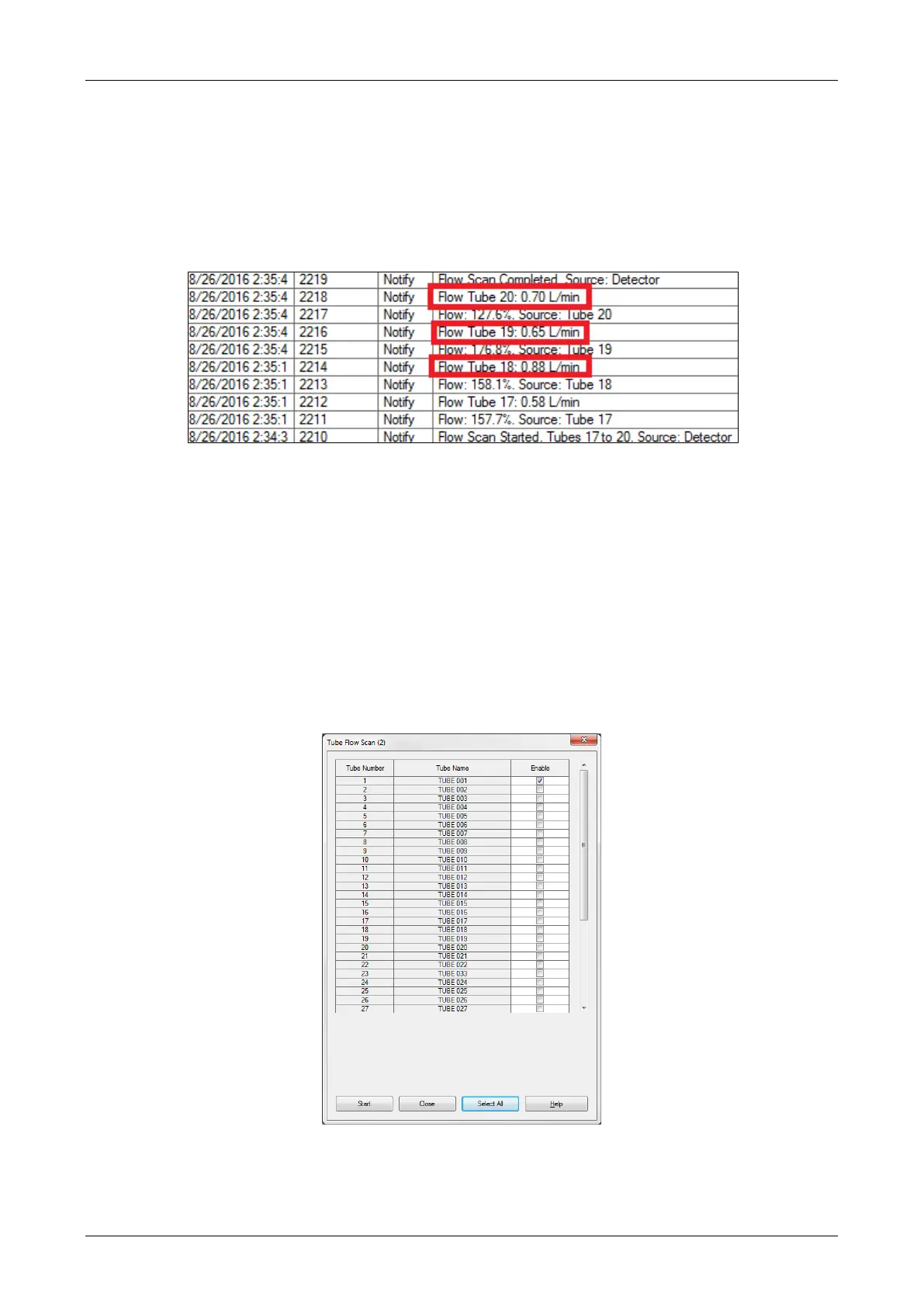 To run a tube flow scan, select Tube Flow Scan from the Device Menu, then tick the tubes for which the