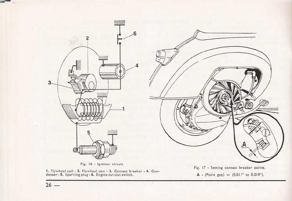 I. Flywheel coU - 2. Flywheel cam - 3. Contact breaker - 4. Con-