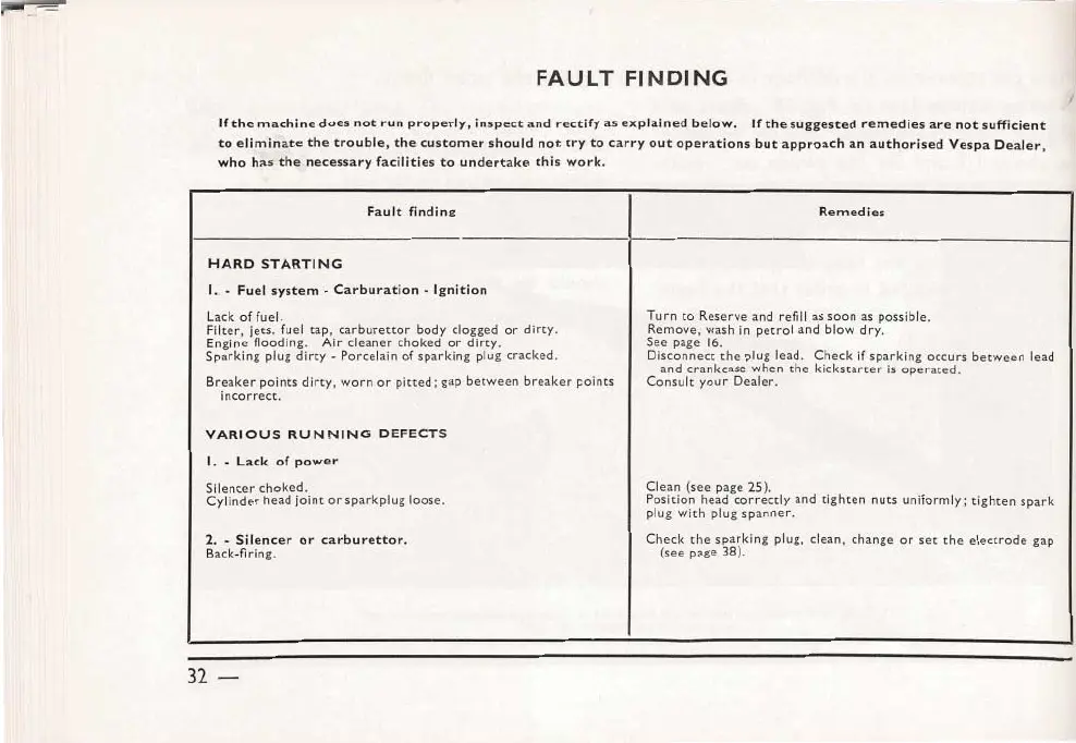 to eliminate the trouble, the customer should not try to carry out operations but approach an authorised Vespa Dealer.