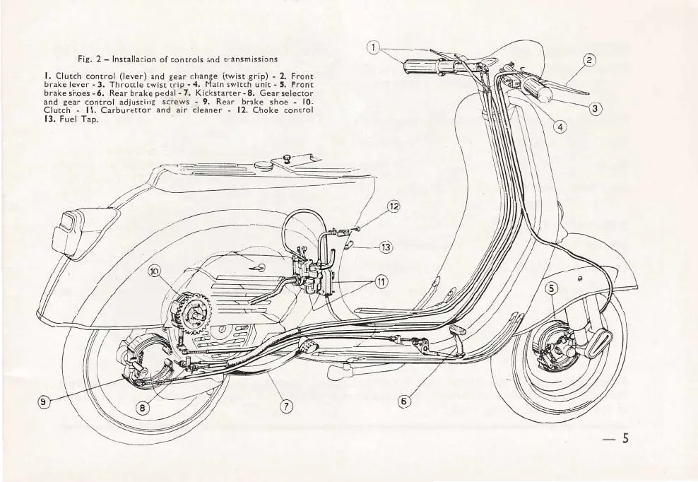 I. Clutch control (lever) and gear change (twist grip) - 2. Front