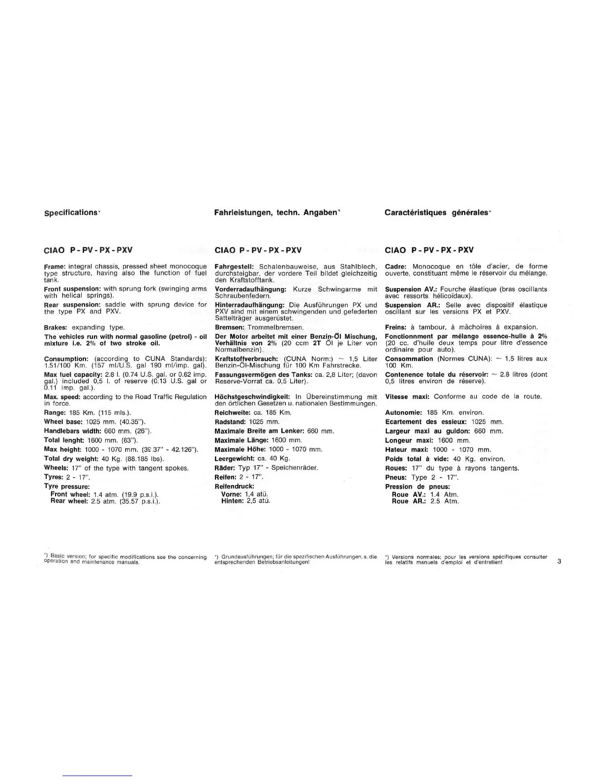 Vespa Bravo - Specifications; Specifications: CIAO P-PV-PX-PXV