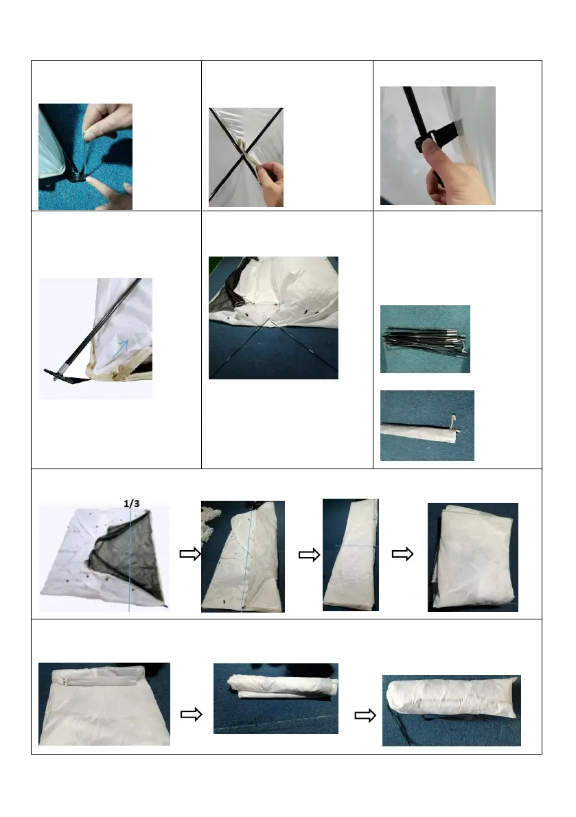 Roll the bagging poles and tent together and load into the large storage bag as shown in